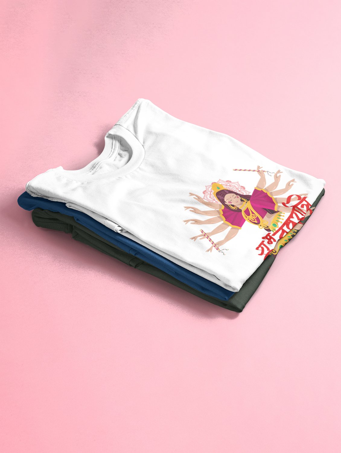 Navratri is a very auspicious festival for hindus. It takes place at the beginning of October and sometimes September. Enjoy the 9 days of festivities with full zeal and make yourself submerged in the love of Maa Durga. Navratri is also known as Durga Puja. And with this Tees, you can shine like a star during this festive season with our navratri themed cotton half sleeved Tshirts. You can pair our t-shirts with trousers and denim of your choice and make it a weekday smart casual or weekend wear. This is durable. This tshirt is smooth and soft which makes you comfortable to wear during all seasons. The printing in it is durable and odourless. It has five sizes, S,M,L,XL,XXL. The Tshirt colour is intact even after repeated washes. It can be kept in your wardrobe and hangers. Please avoid washing mashine to clean this Tee, it may affect the print. Hand wash only. We have brought you many navratri related designs printed on our different colour Tshirts to choose from. Grab it now.