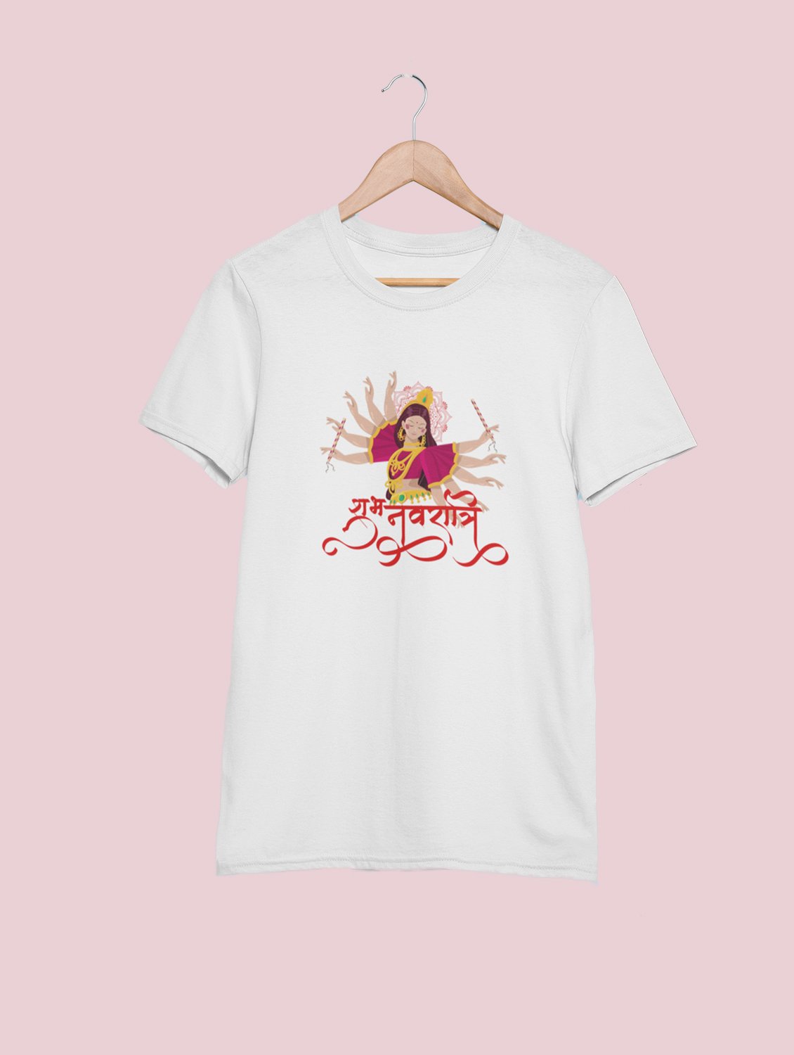 Shubh navratri printed unisex adults round neck cotton half-sleeve white tshirt specially for Navratri festival/ Durga puja