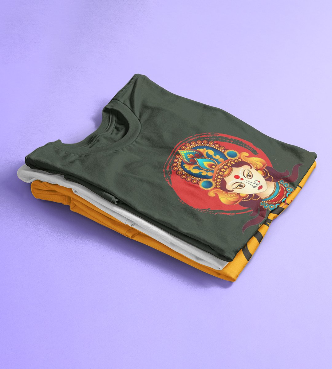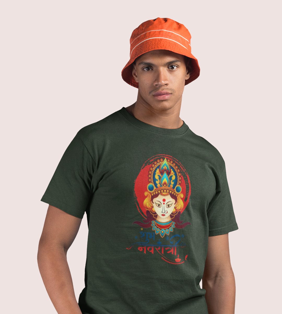 Navratri is a very auspicious festival for hindus. It takes place at the beginning of October and sometimes September. Enjoy the 9 days of festivities with full zeal and make yourself submerged in the love of Maa Durga. Navratri is also known as Durga Puja. And with this Tees, you can shine like a star during this festive season with our navratri themed cotton half sleeved Tshirts. You can pair our t-shirts with trousers and denim of your choice and make it a weekday smart casual or weekend wear. This is durable. This tshirt is smooth and soft which makes you comfortable to wear during all seasons. The printing in it is durable and odourless. It has five sizes, S,M,L,XL,XXL. The Tshirt colour is intact even after repeated washes. It can be kept in your wardrobe and hangers. Please avoid washing mashine to clean this Tee, it may affect the print. Hand wash only. We have brought you many navratri related designs printed on our different colour Tshirts to choose from. Grab it now.