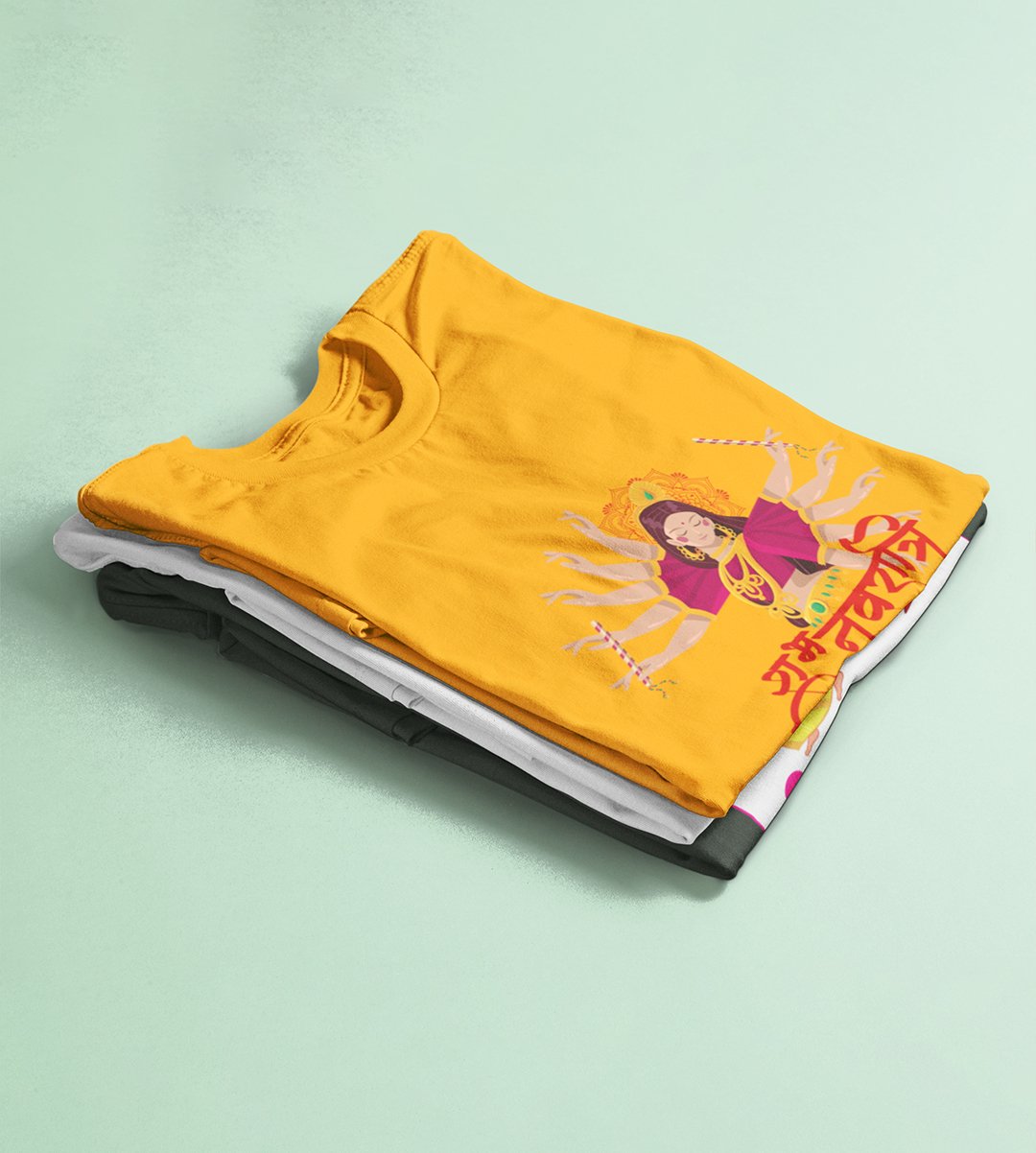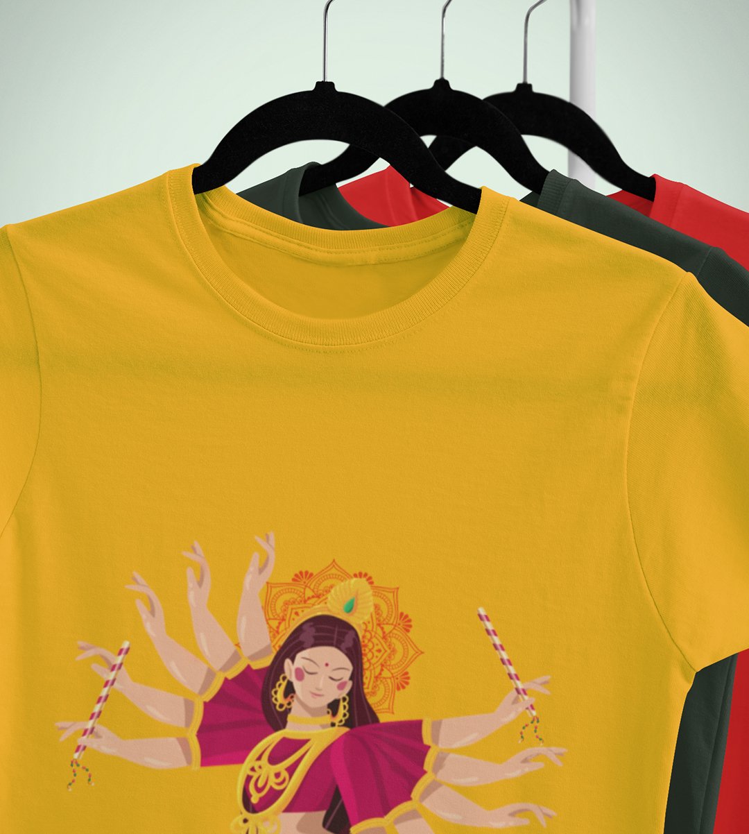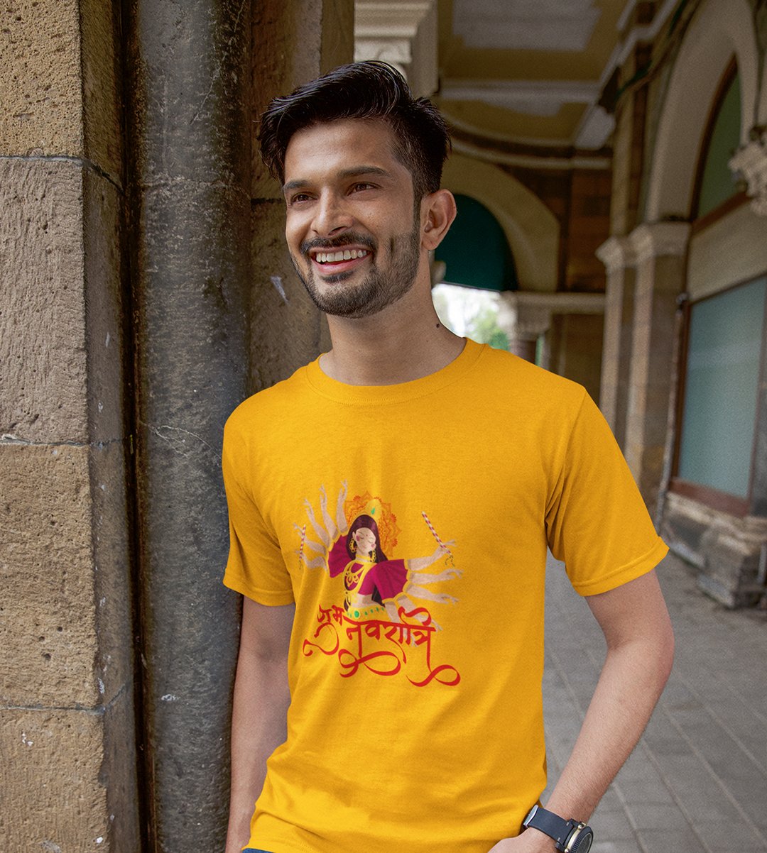 Navratri is a very auspicious festival for hindus. It takes place at the beginning of October and sometimes September. Enjoy the 9 days of festivities with full zeal and make yourself submerged in the love of Maa Durga. Navratri is also known as Durga Puja. And with this Tees, you can shine like a star during this festive season with our navratri themed cotton half sleeved Tshirts. You can pair our t-shirts with trousers and denim of your choice and make it a weekday smart casual or weekend wear. This is durable. This tshirt is smooth and soft which makes you comfortable to wear during all seasons. The printing in it is durable and odourless. It has five sizes, S,M,L,XL,XXL. The Tshirt colour is intact even after repeated washes. It can be kept in your wardrobe and hangers. Please avoid washing mashine to clean this Tee, it may affect the print. Hand wash only. We have brought you many navratri related designs printed on our different colour Tshirts to choose from. Grab it now.