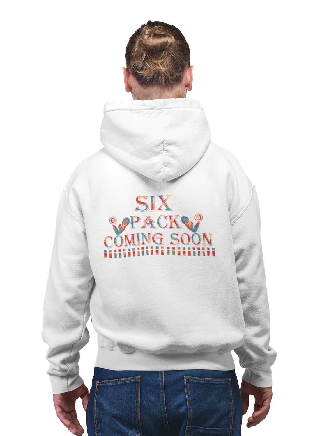 Six Pack Coming Soon ( Multicolour text )printed activewear white hoodies for winter casual wear specially for Men