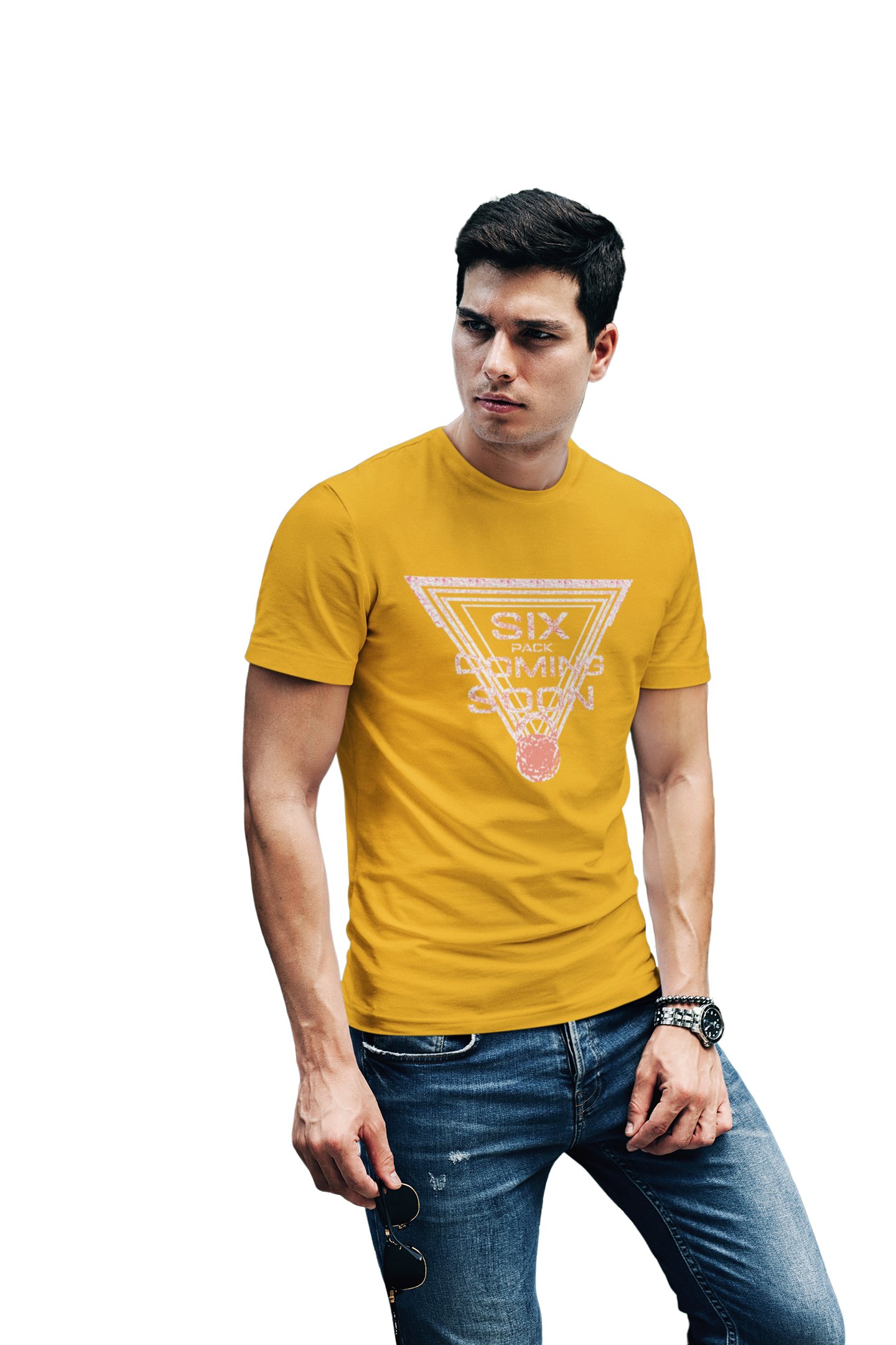 Six Pack Coming Soon, Scribbled Letters, Round Neck Gym Tshirt (Yellow Tshirt) - Clothes for Gym Lovers - Suitable for Gym Going Person - Foremost Gifting Material for Your Friends and Close Ones