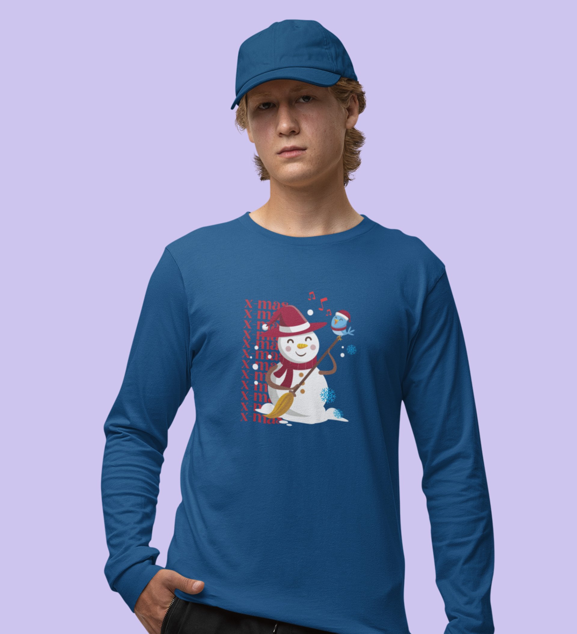Snowman Sings: Beautifully CraftedFull Sleeve T-shirt Blue Perfect Gift For Secret Santa