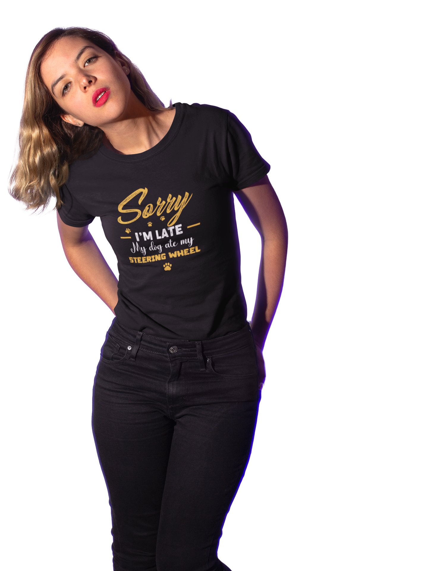 Sorry i am late my dog ate my steering wheel -Black-printed cotton t-shirt - comfortable, stylish