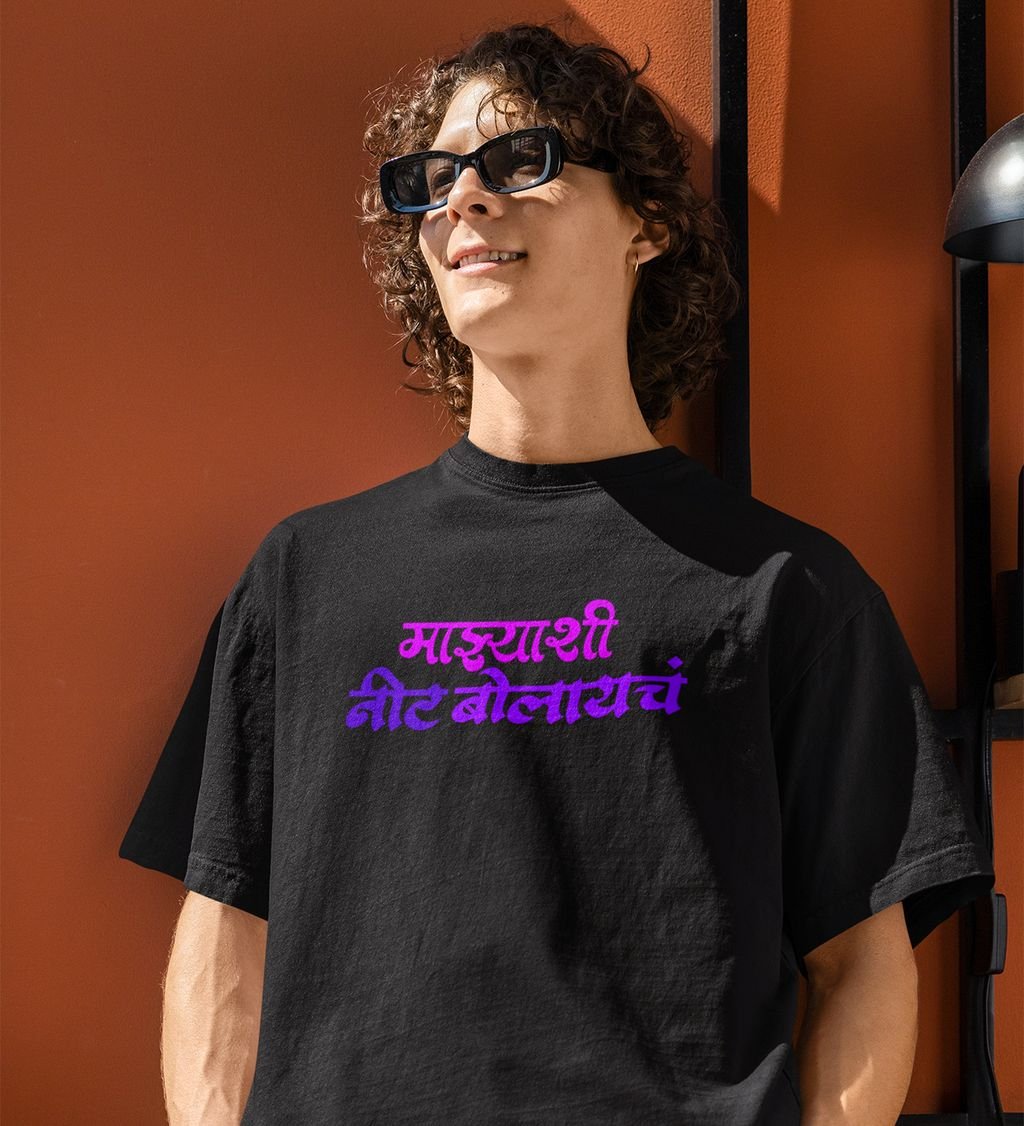 Celebrate the vibrant spirit of Mumbai with our the bold Marathi typography this shirt is perfect for those who take pride in their city Made from soft high quality fabric it ensures all day comfort Wear it to show off your love for Mumbai