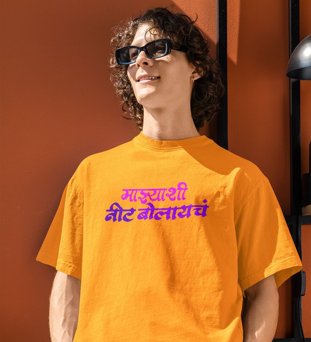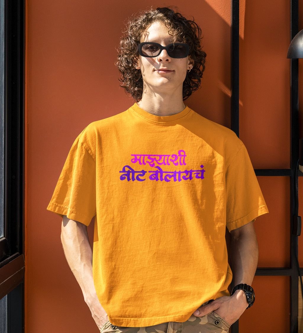 Celebrate the vibrant spirit of Mumbai with our the bold Marathi typography this shirt is perfect for those who take pride in their city Made from soft high quality fabric it ensures all day comfort Wear it to show off your love for Mumbai