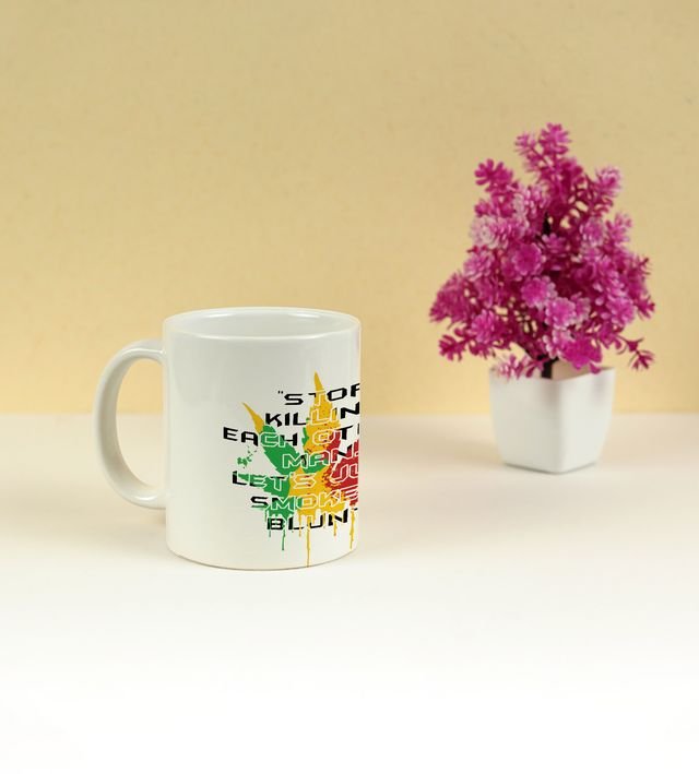 Start your day with a burst of vibrant energy! This printed coffee mug features a psychedelic leaf artwork surrounded by colorful flame-like patterns