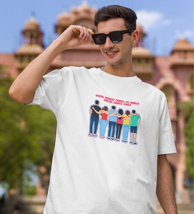 Squad Comes First White Round Neck Cotton Half Sleeved Men T Shirt with Printed Graphics