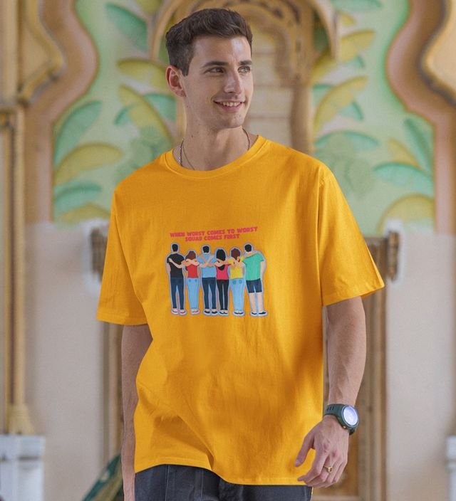 Squad Comes First Yellow Round Neck Cotton Half Sleeved Men T Shirt with Printed Graphics