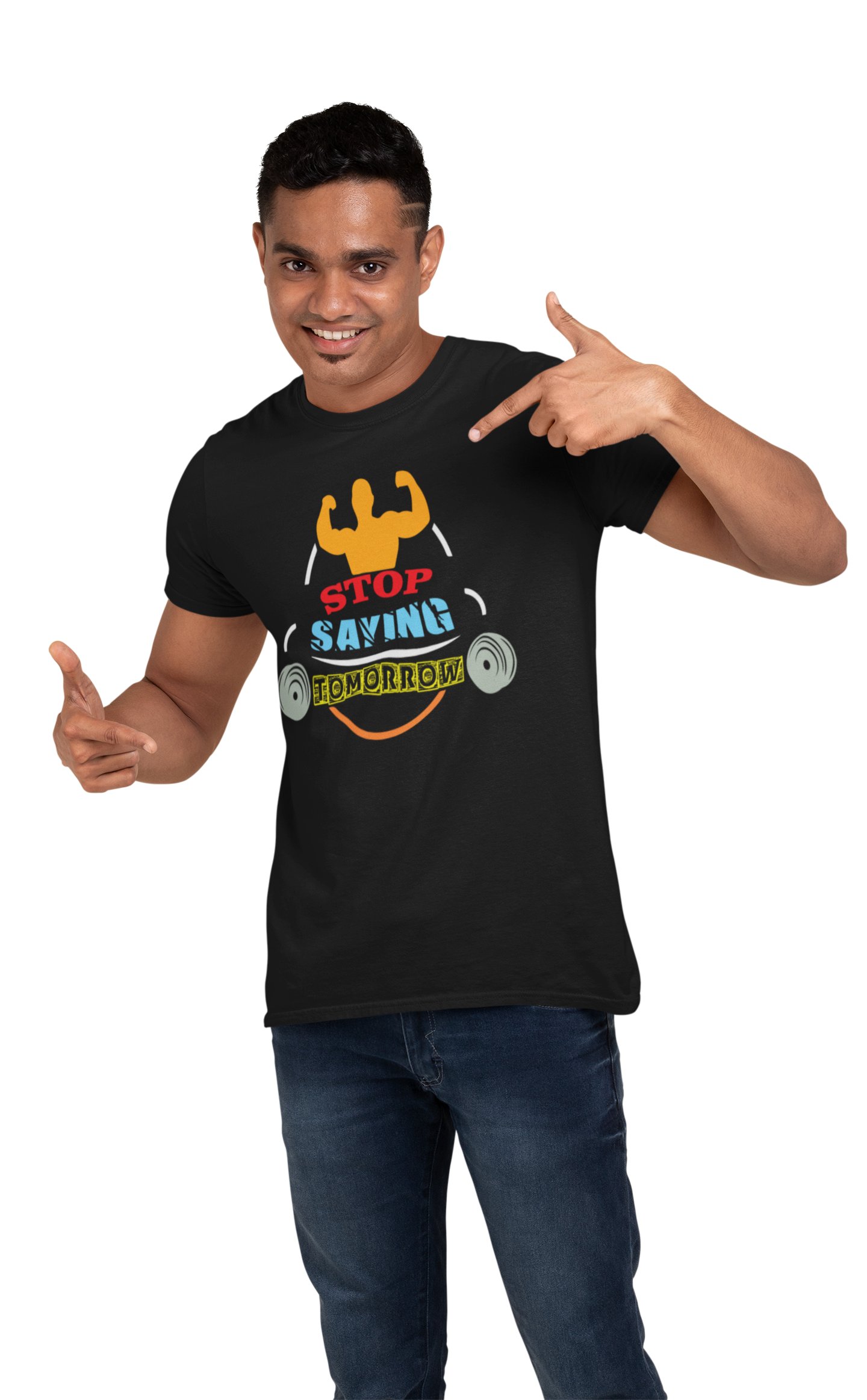 Stop Saying Tomorrow, (BG Orange, Blue and Yellow), Round Neck Gym Tshirt (White Tshirt) - Clothes for Gym Lovers - Suitable for Gym Going Person - Foremost Gifting Material for Your Friends and Close Ones