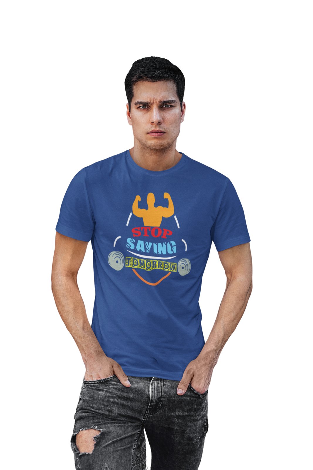 Stop Saying Tomorrow, (BG Yellow, Red, Blue), Round Neck Gym Tshirt (Blue Tshirt) - Clothes for Gym Lovers - Suitable for Gym Going Person - Foremost Gifting Material for Your Friends and Close Ones