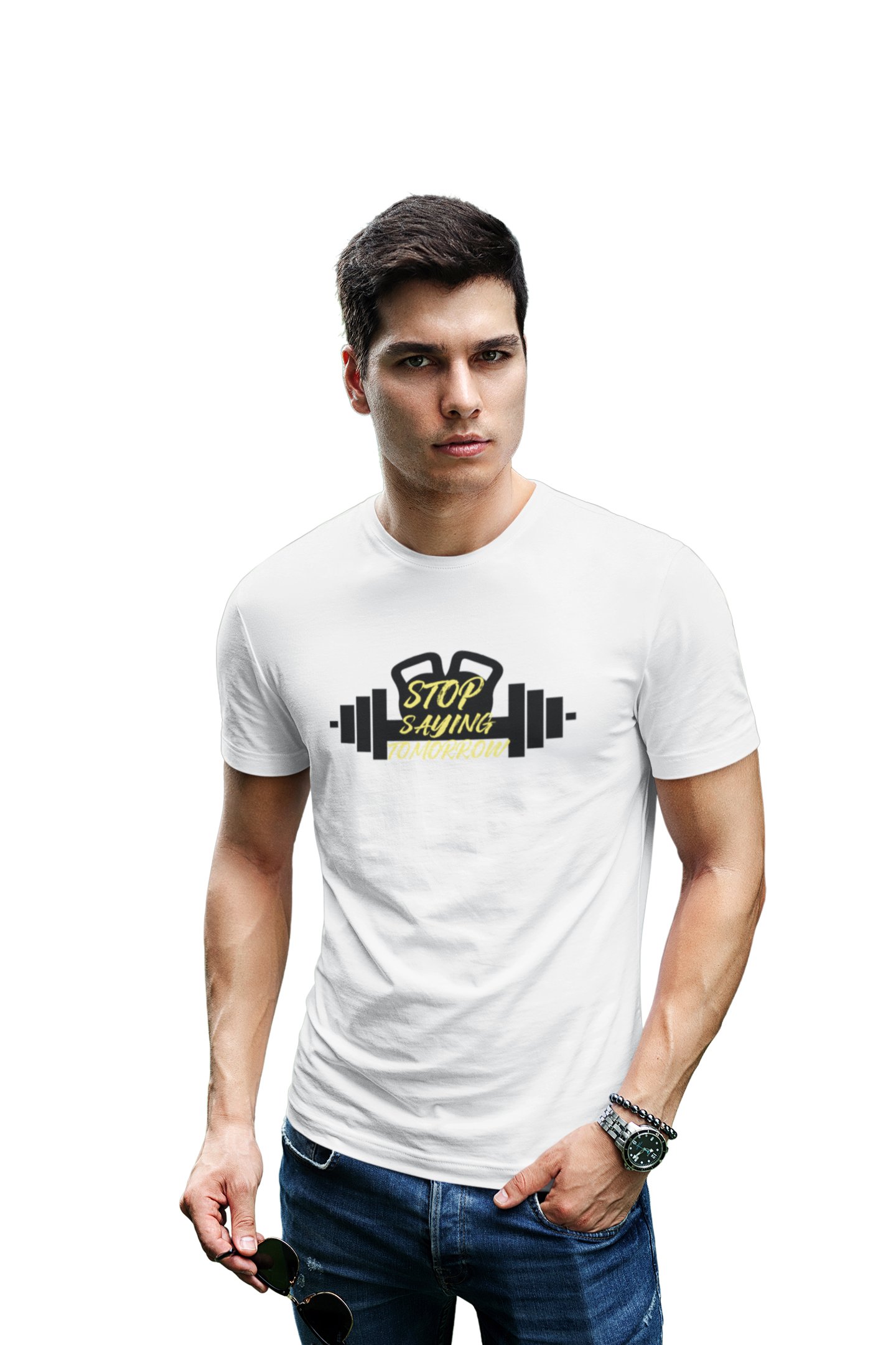 Stop saying Tomorrow, In Bar, Round Neck Gym Tshirt (White Tshirt) - Clothes for Gym Lovers - Suitable for Gym Going Person - Foremost Gifting Material for Your Friends and Close Ones