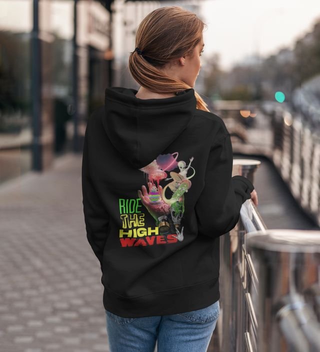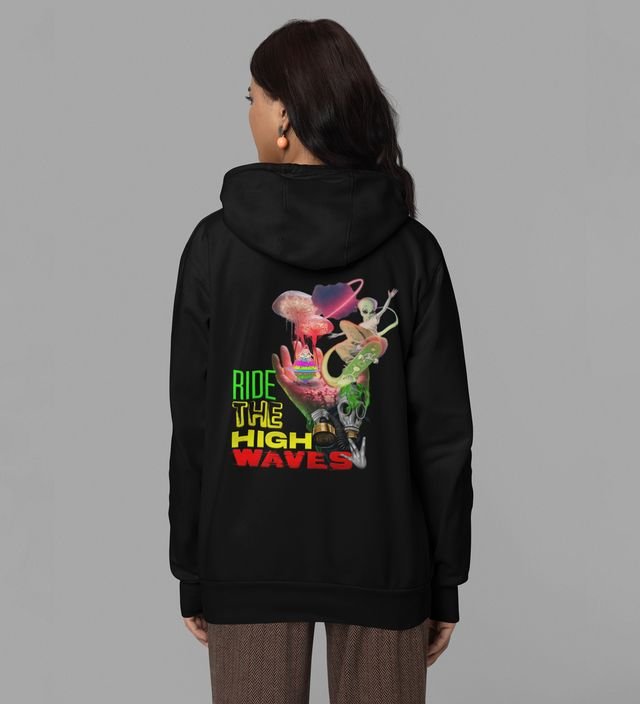 Surf the Cosmic Flow Ride The High Waves Black Cotton Printed Hoodies For Women