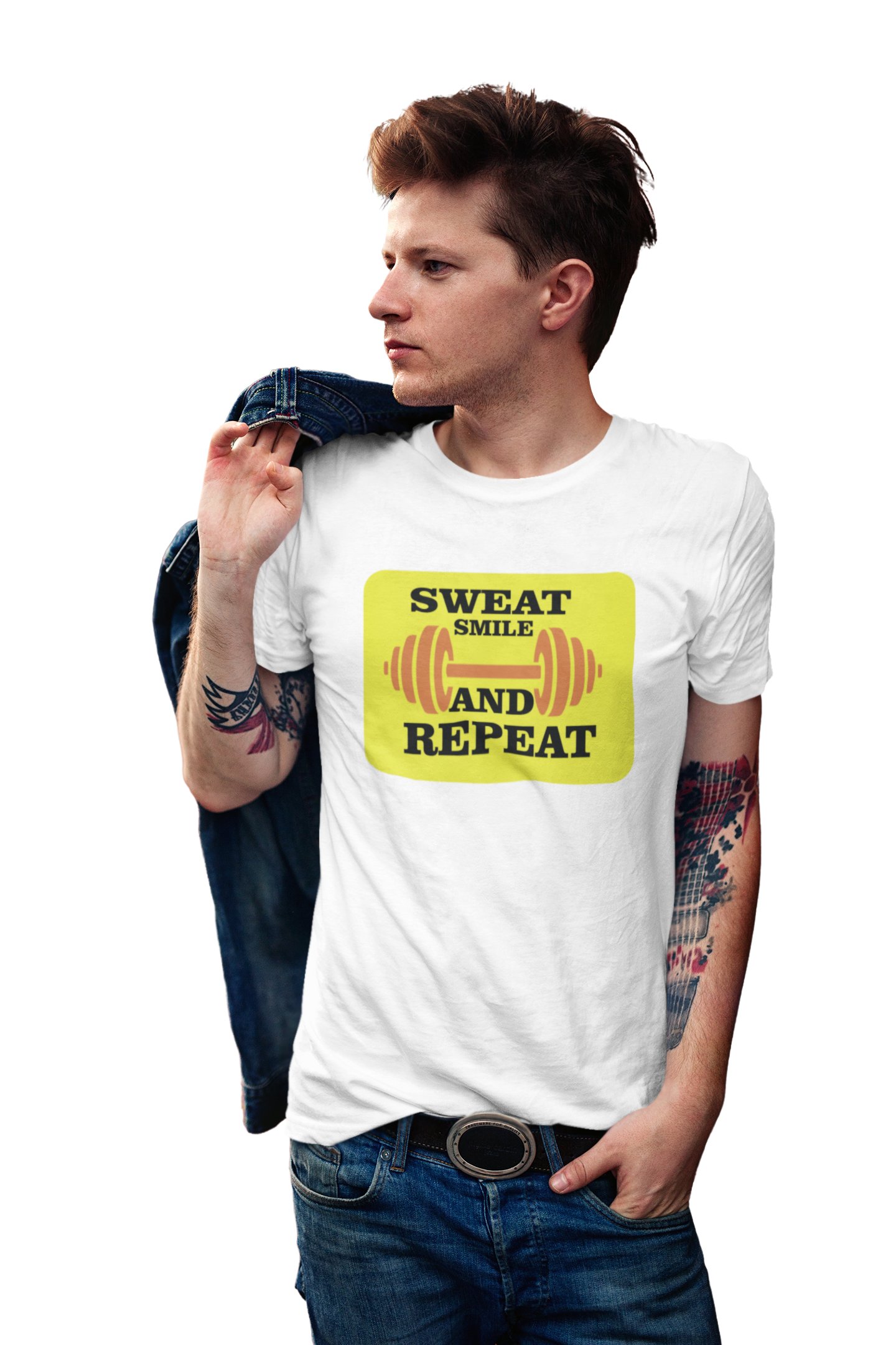 Sweat, Smile And Repeat, (BG Yellow), Round Neck Gym Tshirt (White Tshirt) - Clothes for Gym Lovers - Suitable for Gym Going Person - Foremost Gifting Material for Your Friends and Close Ones