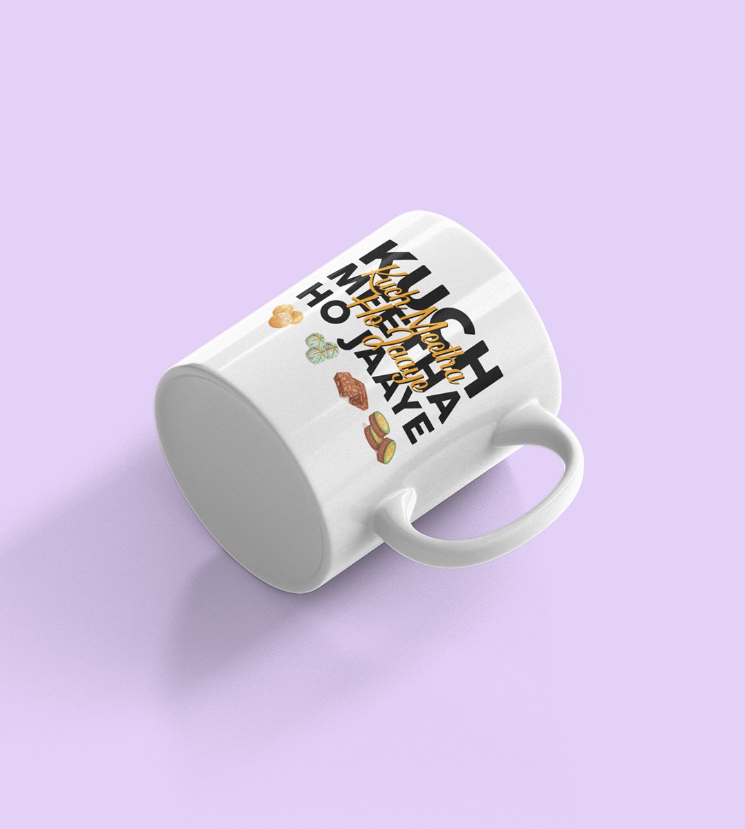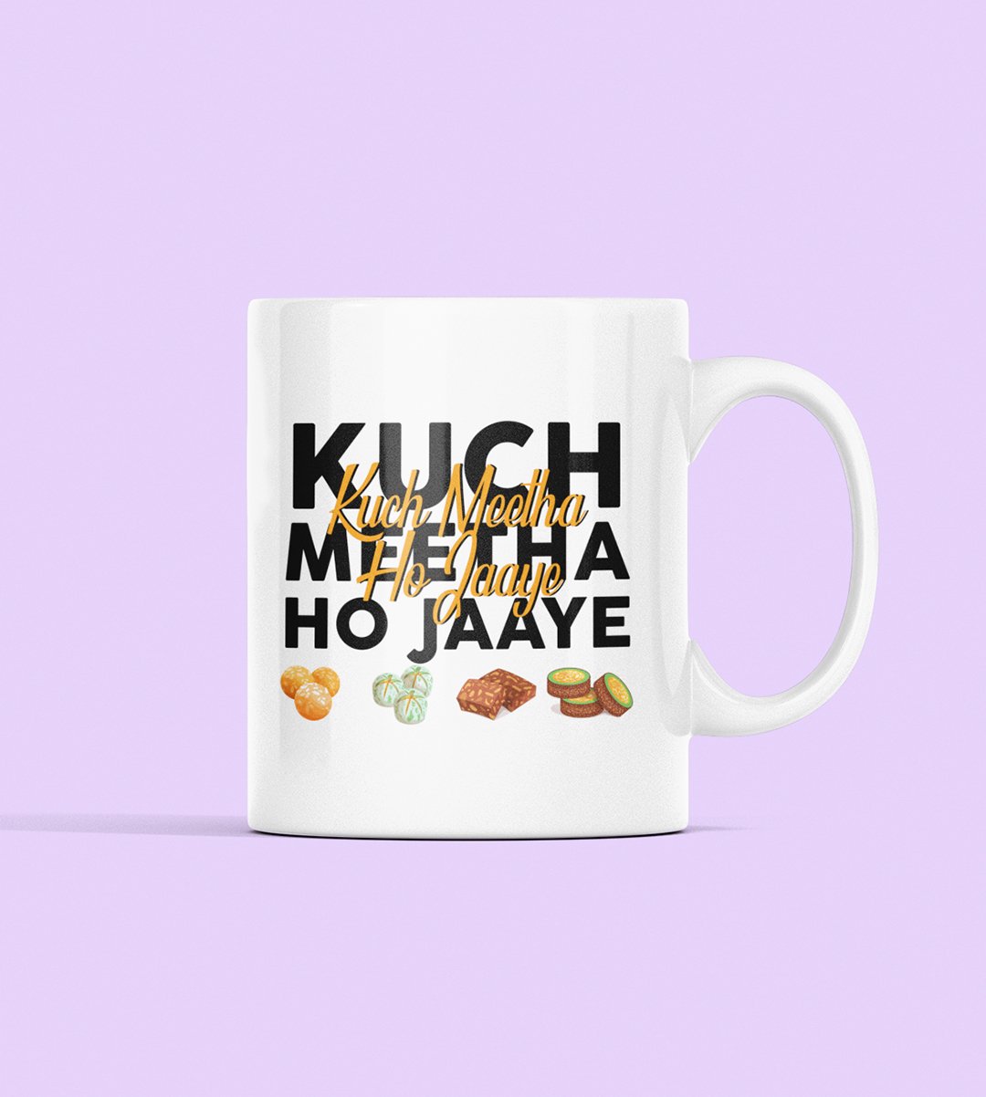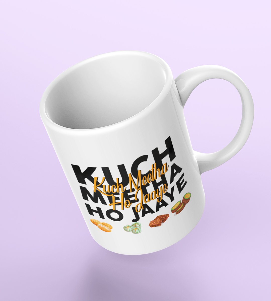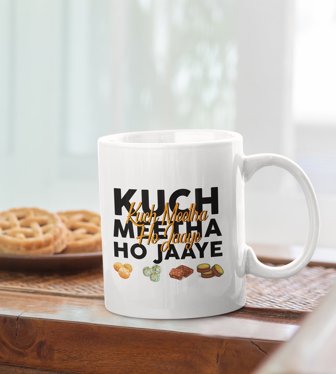 Satisfy your sweet cravings with our "Sweet Indulgence" Coffee Mug. The message "Kuch Meetha Ho Jaye" invites you to dive into a delightful world of sweets and treats. This playful design features an array of delectable confections, making every sip a celebration of sweetness and joy.