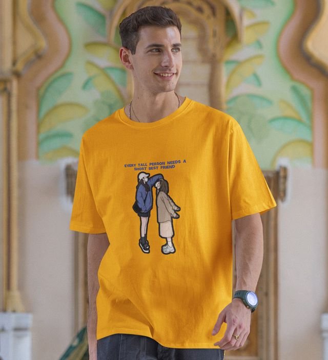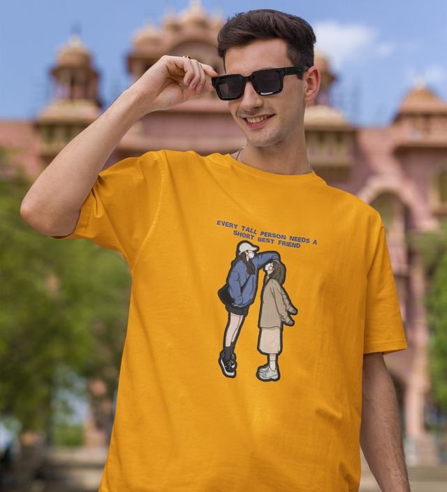 Tall And Short Duo Yellow Round Neck Cotton Half Sleeved Men T Shirt with Printed Graphics