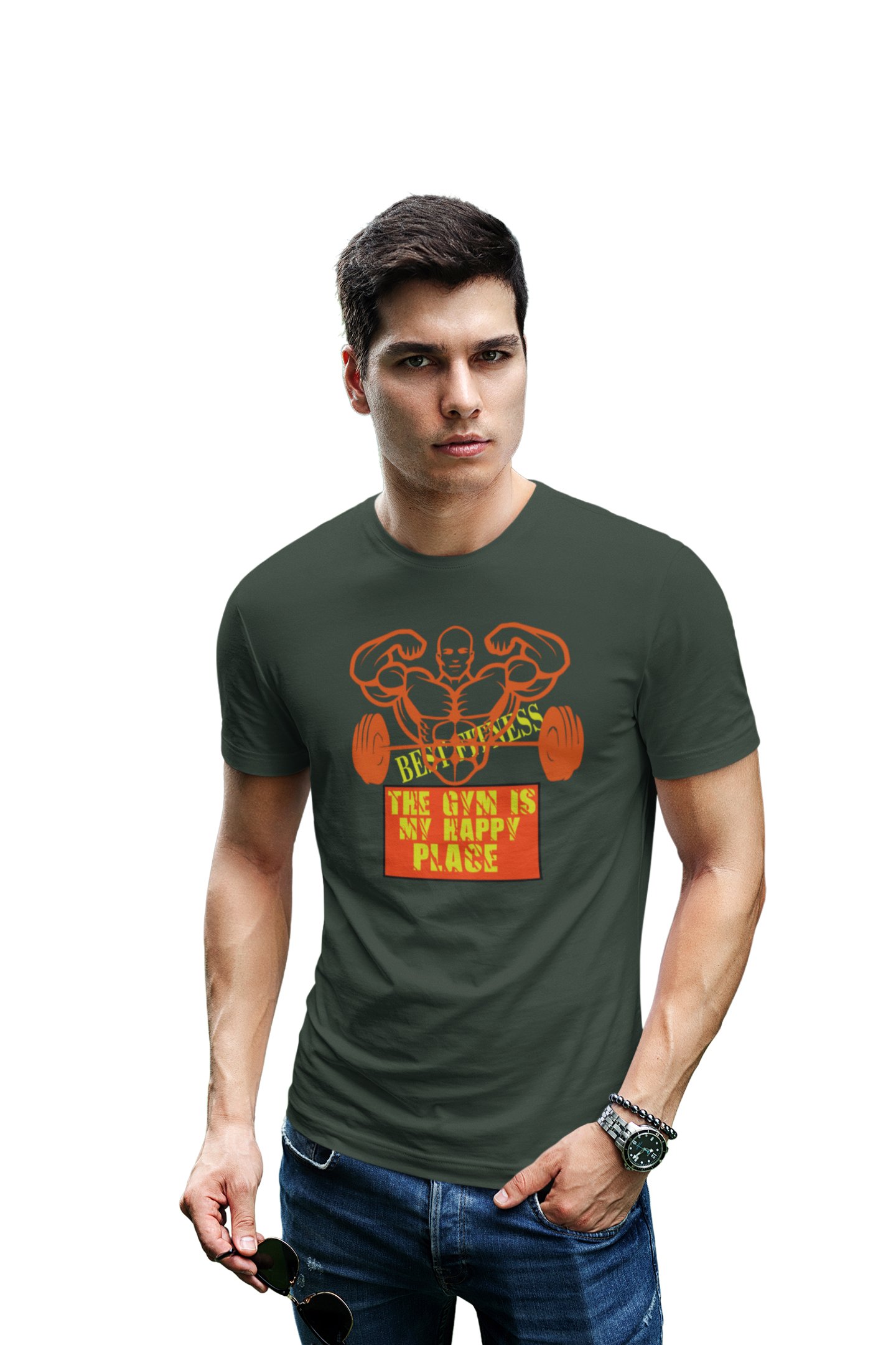 The Gym Is My Happy Place, (BG Orange), Round Neck Gym Tshirt - Foremost Gifting Material for Your Friends and Close Ones