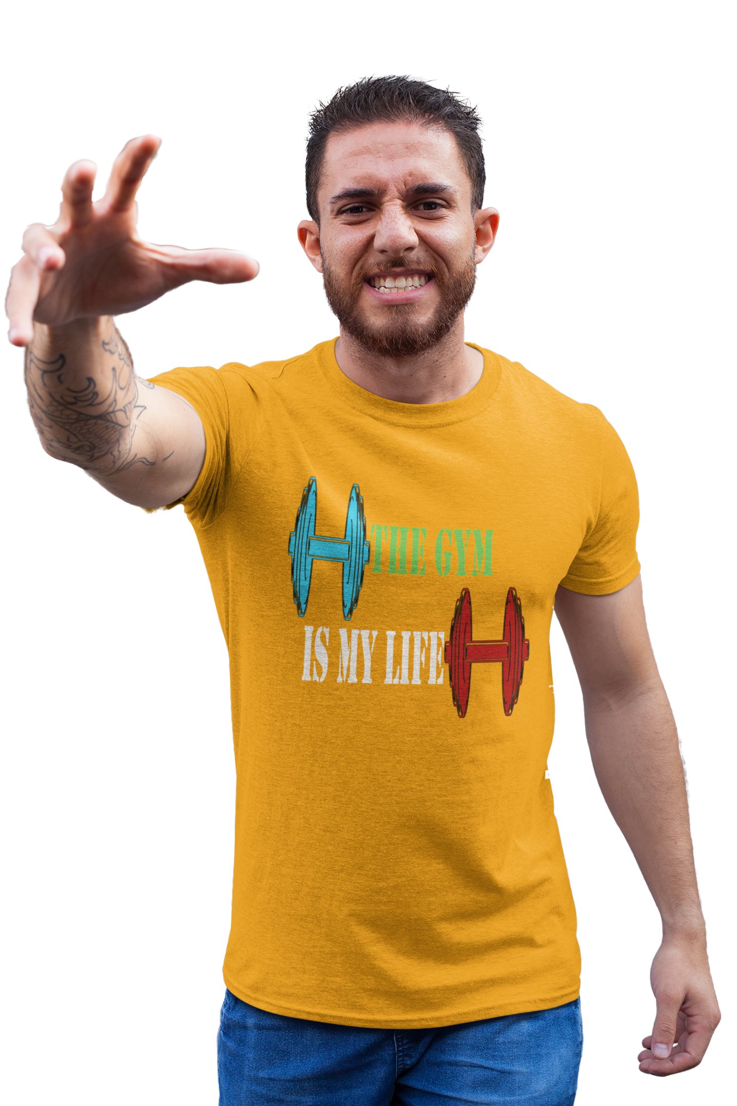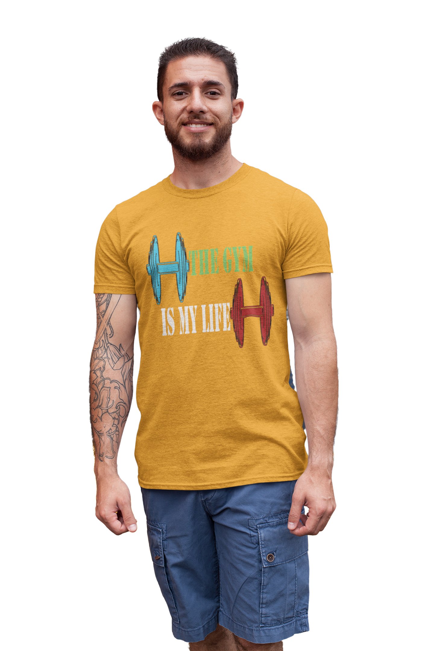 The Gym is My Life, 2 Dumbles, Round Neck Gym Tshirt (Yellow Tshirt) - Clothes for Gym Lovers - Suitable for Gym Going Person - Foremost Gifting Material for Your Friends and Close Ones