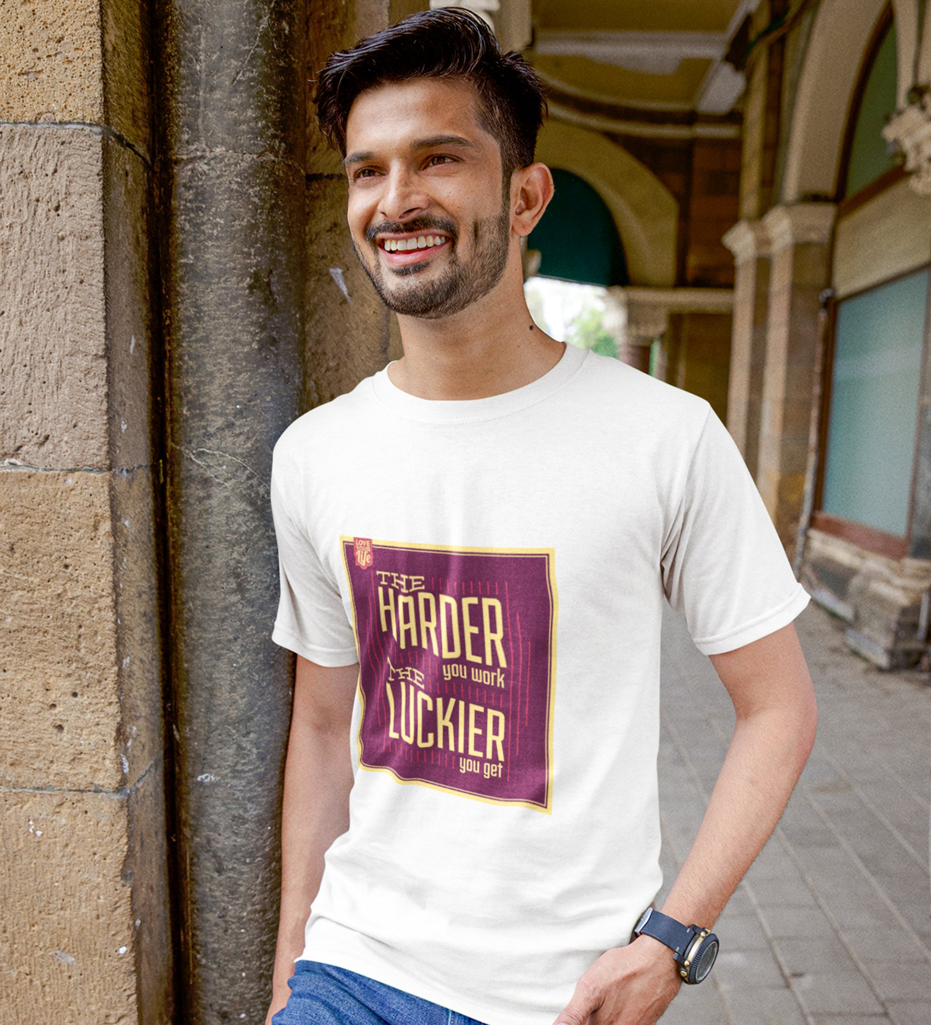 Hardwork Brings Luck White Round Neck Cotton Half Sleeved Men's T-Shirt with Printed Graphics