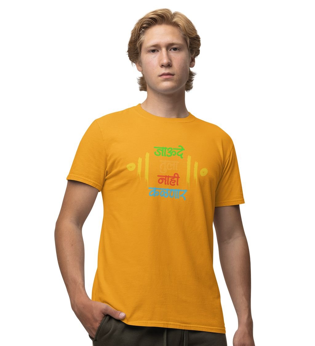 The Marathi Giveup Yellow Round Neck Cotton Half Sleeved Mens T Shirt with Printed Graphics