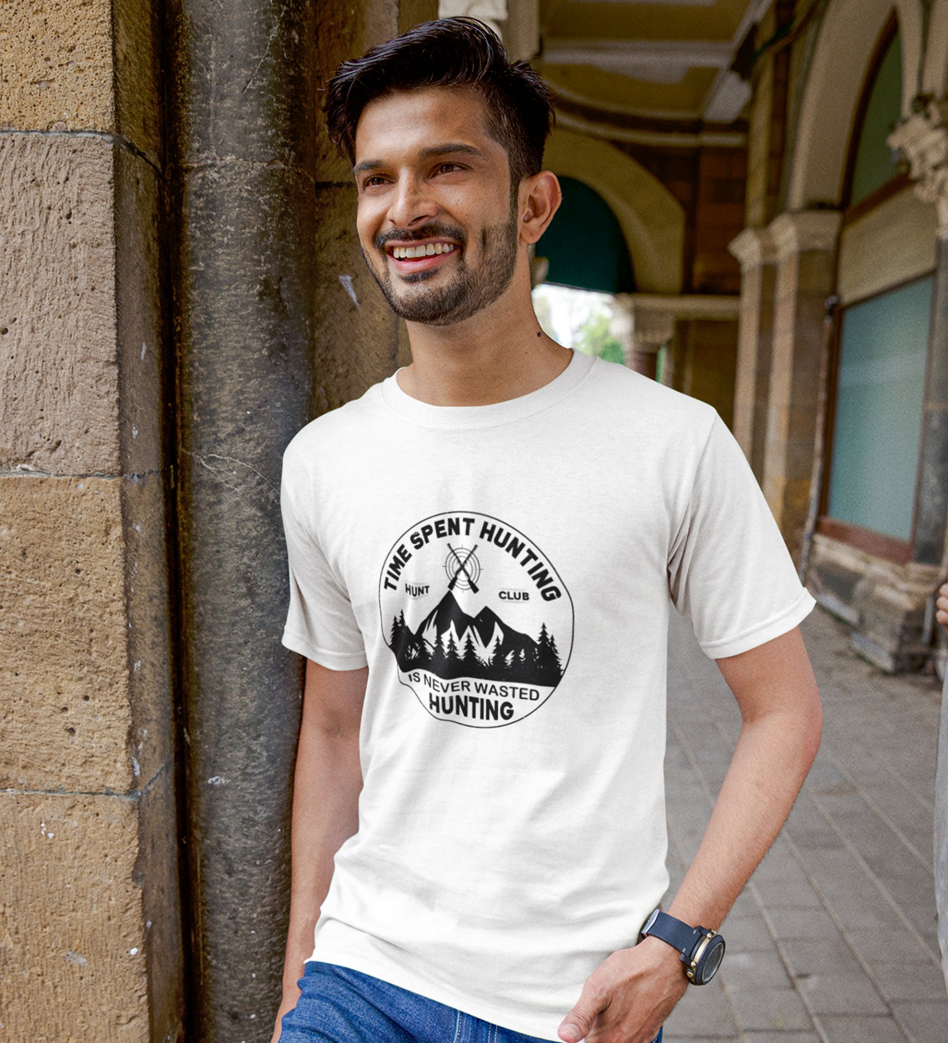 JD.TRENDS Time Spent Hunting White Round Neck Cotton Half Sleeved Men's T-Shirt with Printed Graphics