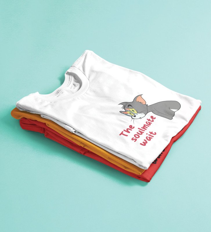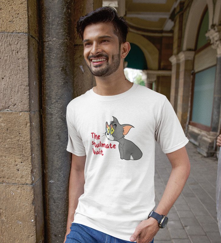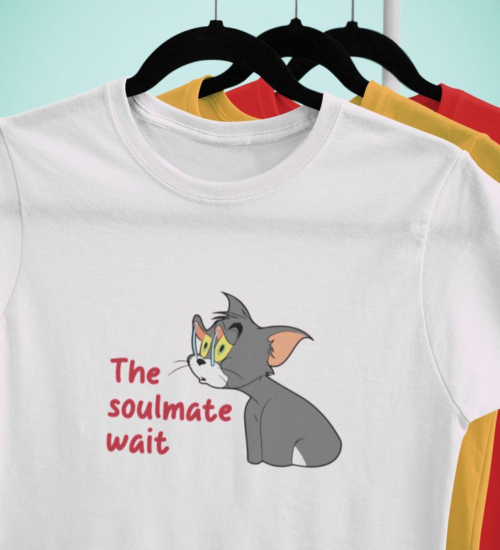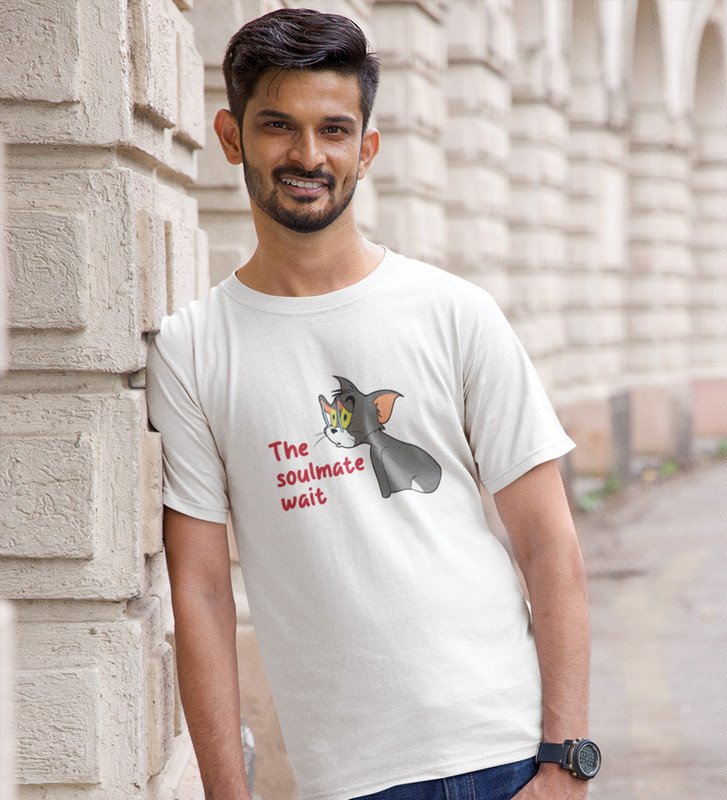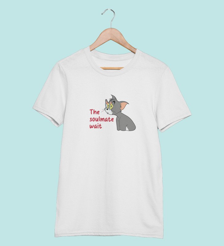 Tom Is Waiting For Soulmate: Printed (white) T-Shirt For Singles