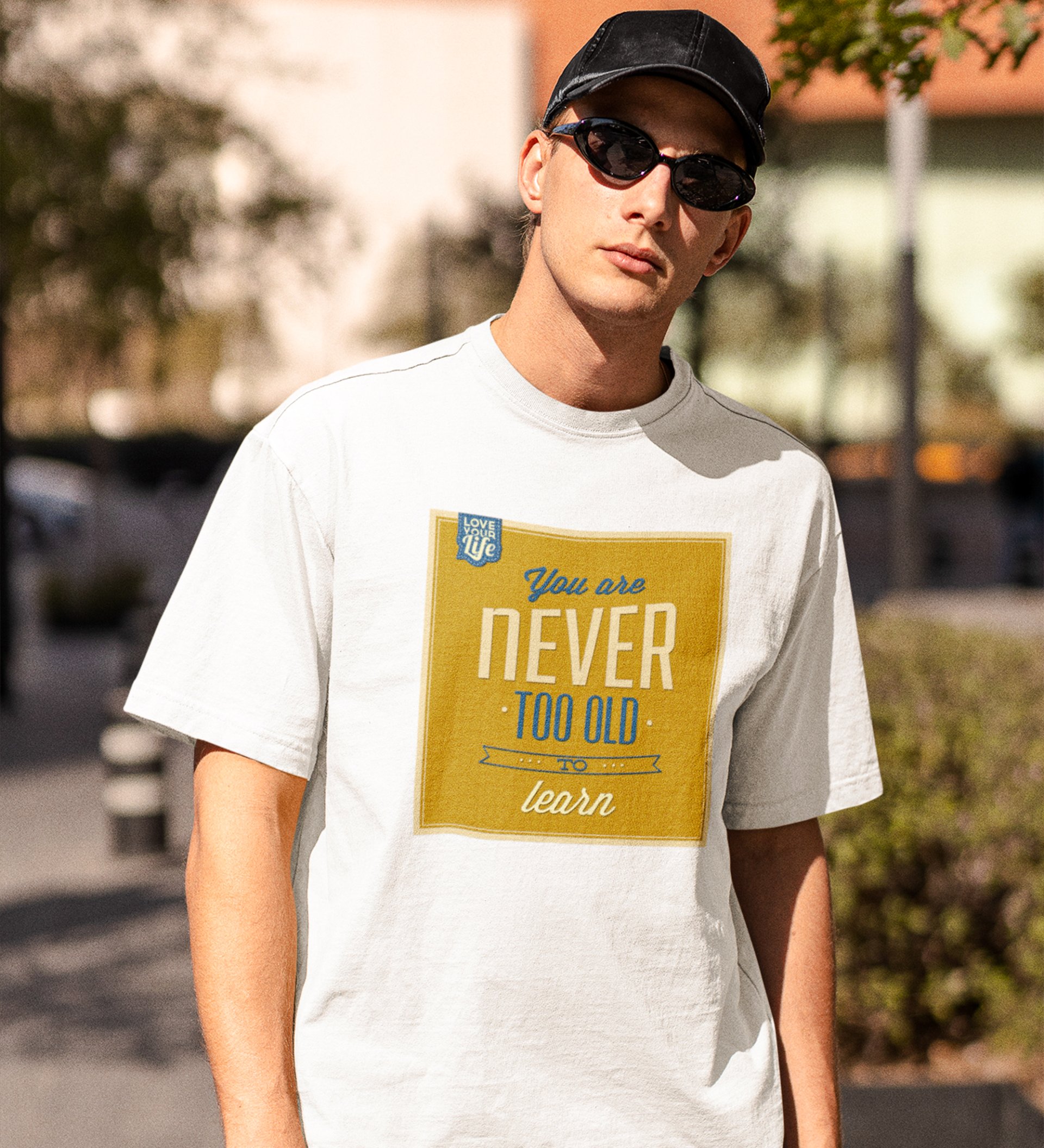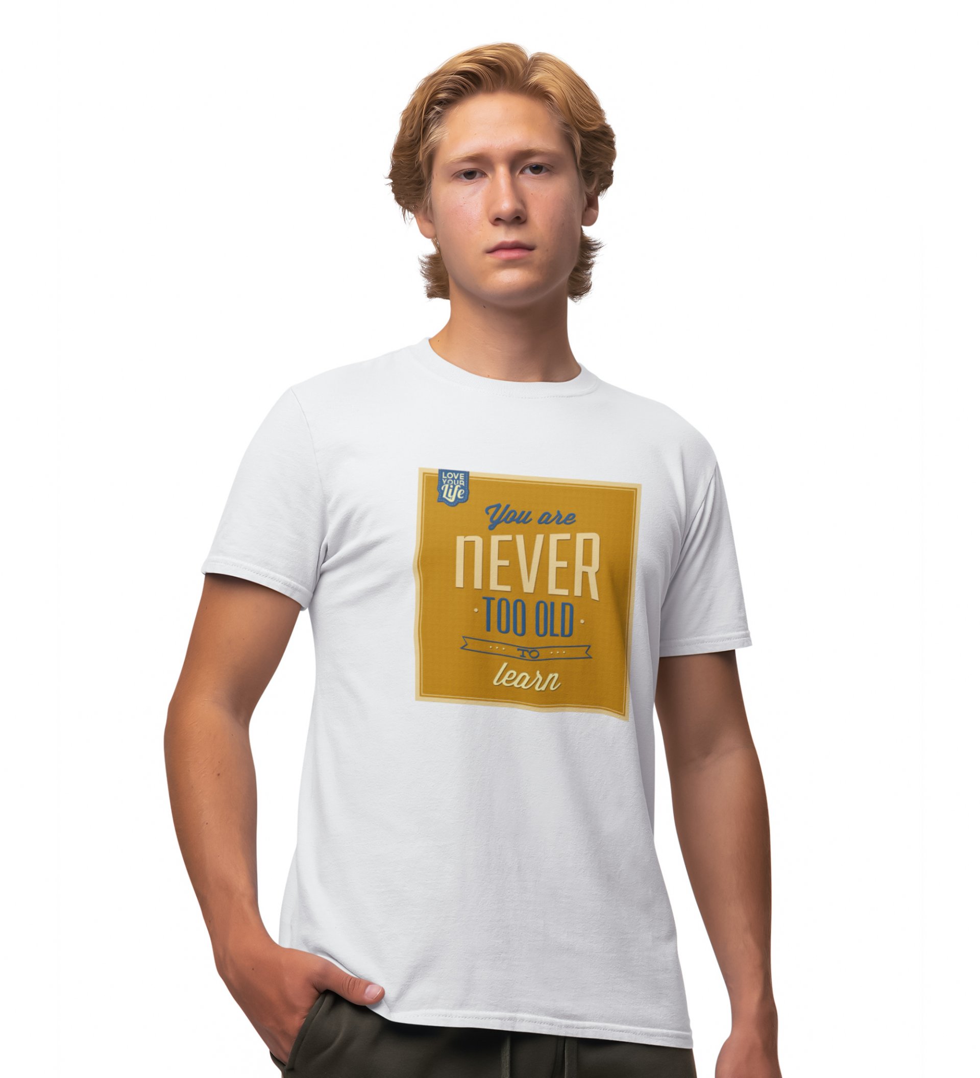 Never Too Late White Round Neck Cotton Half Sleeved Men's T-Shirt with Printed Graphics