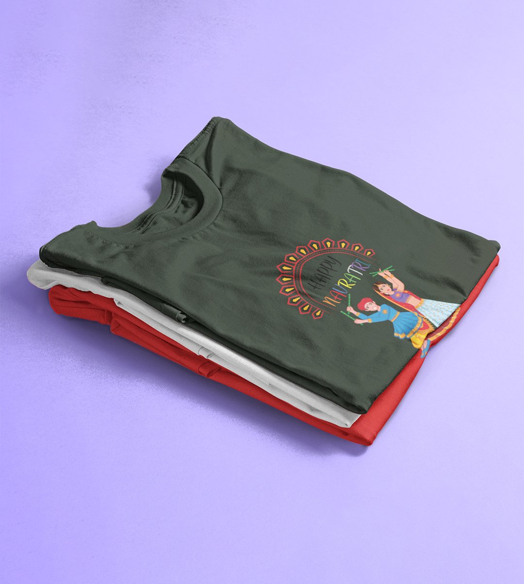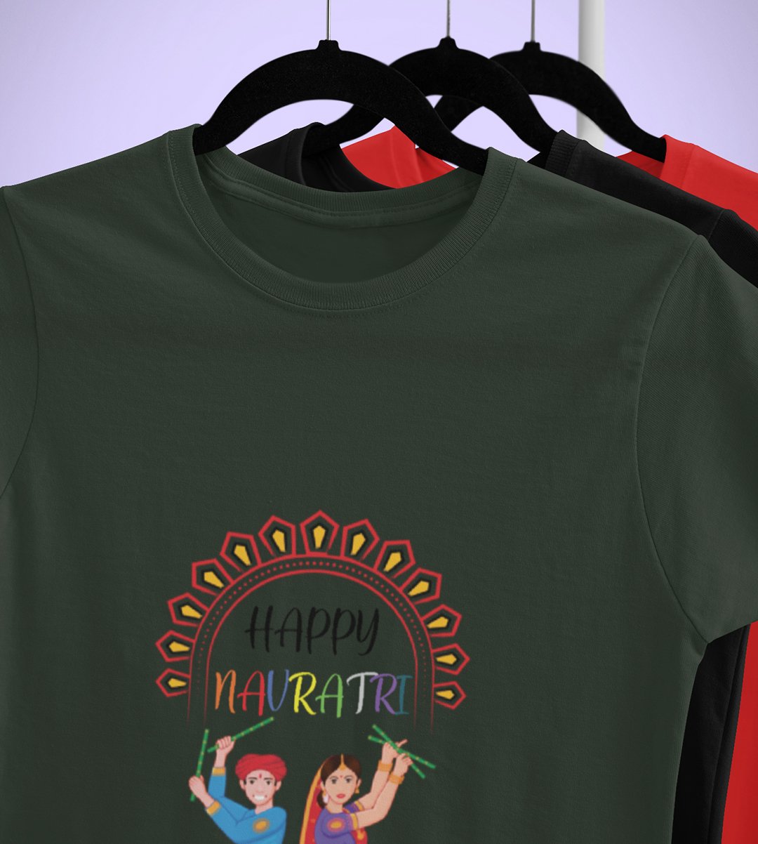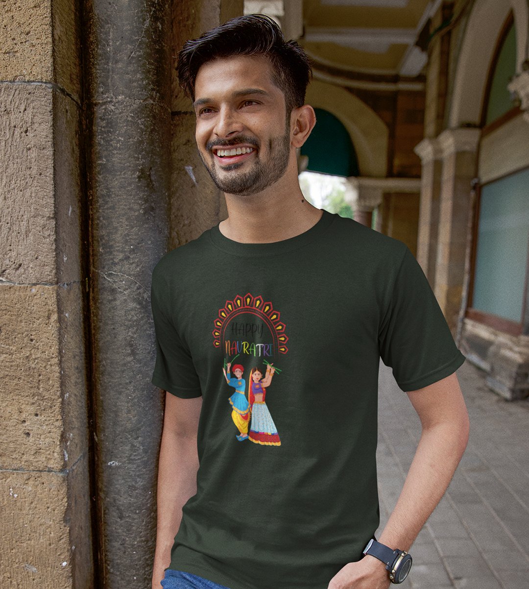 Navratri is a very auspicious festival for hindus. It takes place at the beginning of October and sometimes September. Enjoy the 9 days of festivities with full zeal and make yourself submerged in the love of Maa Durga. Navratri is also known as Durga Puja. And with this Tees, you can shine like a star during this festive season with our navratri themed cotton half sleeved Tshirts. You can pair our t-shirts with trousers and denim of your choice and make it a weekday smart casual or weekend wear. This is durable. This tshirt is smooth and soft which makes you comfortable to wear during all seasons. The printing in it is durable and odourless. It has five sizes, S,M,L,XL,XXL. The Tshirt colour is intact even after repeated washes. It can be kept in your wardrobe and hangers. Please avoid washing mashine to clean this Tee, it may affect the print. Hand wash only. We have brought you many navratri related designs printed on our different colour Tshirts to choose from. Grab it now.