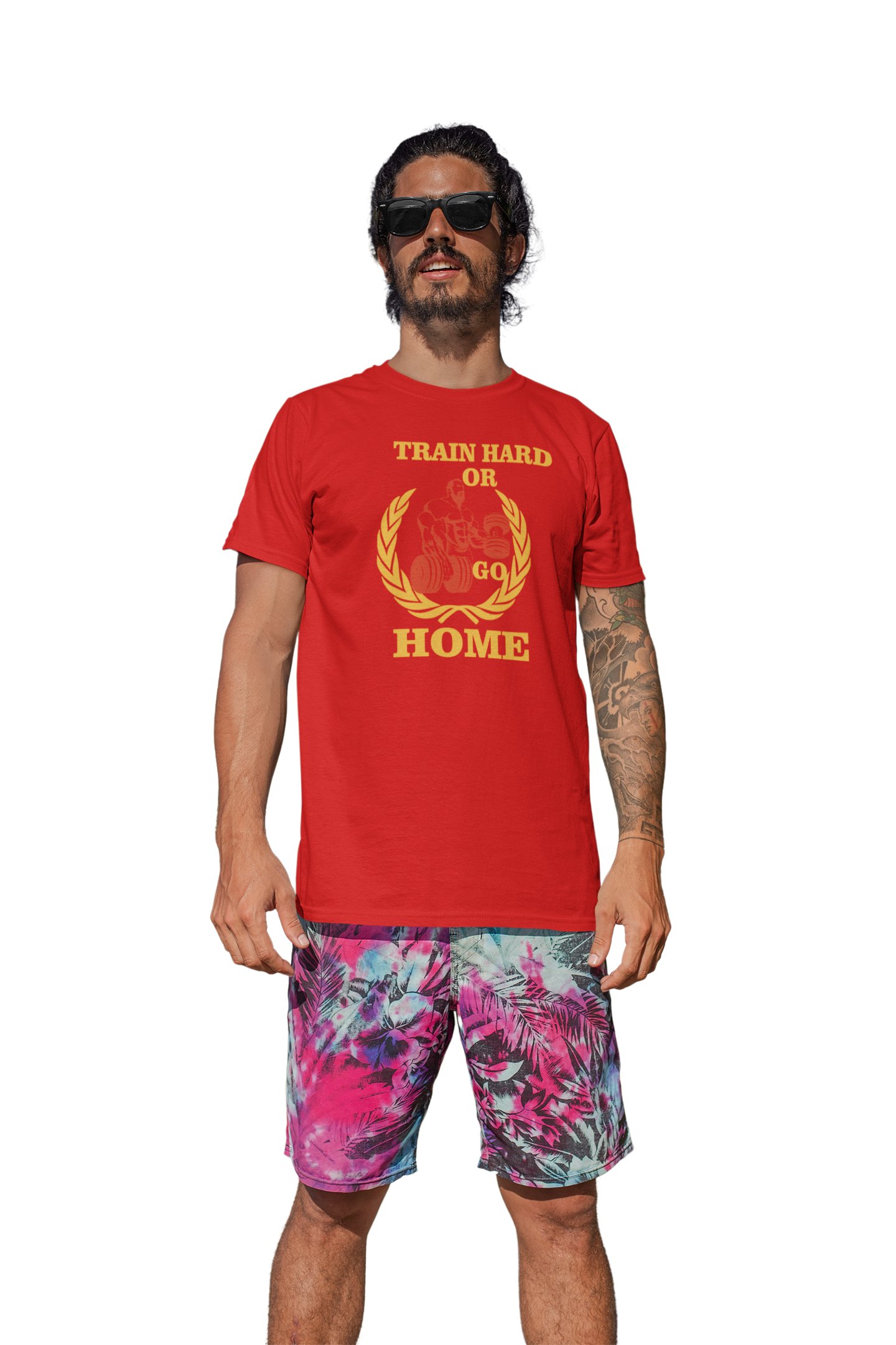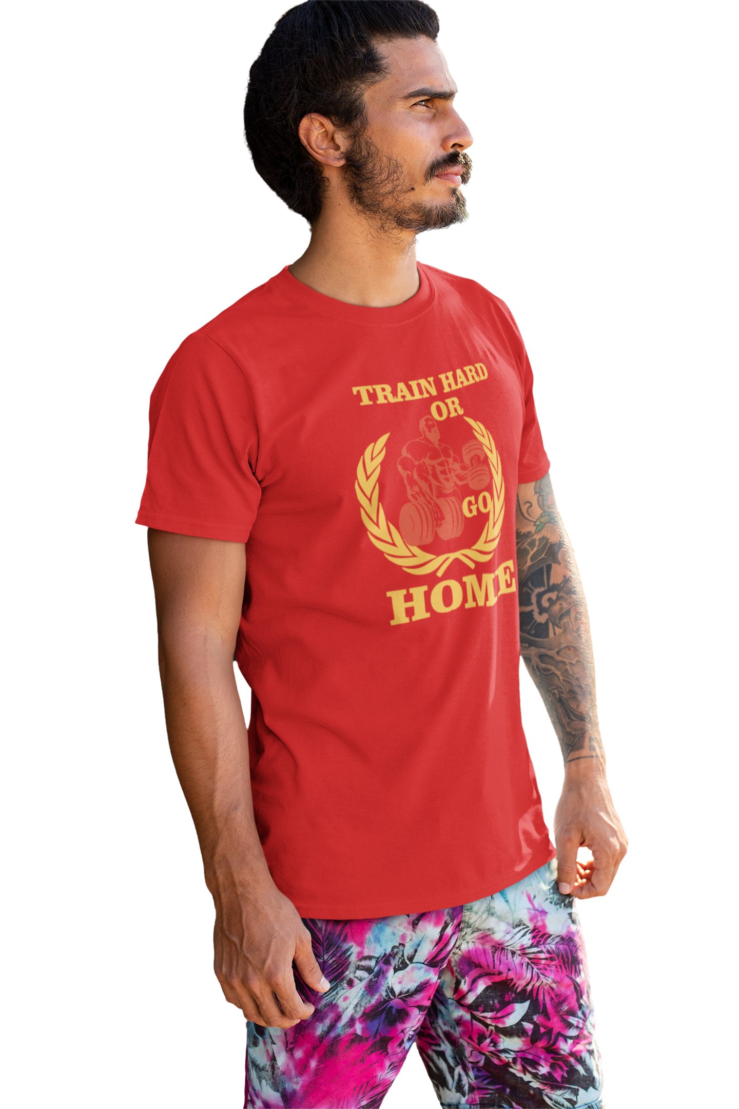 Train Hard or Go Home Round Neck Gym Tshirt (BG Golden and Red) (Red Tshirt) - Clothes for Gym Lovers - Suitable for Gym Going Person - Foremost Gifting Material for Your Friends and Close Ones
