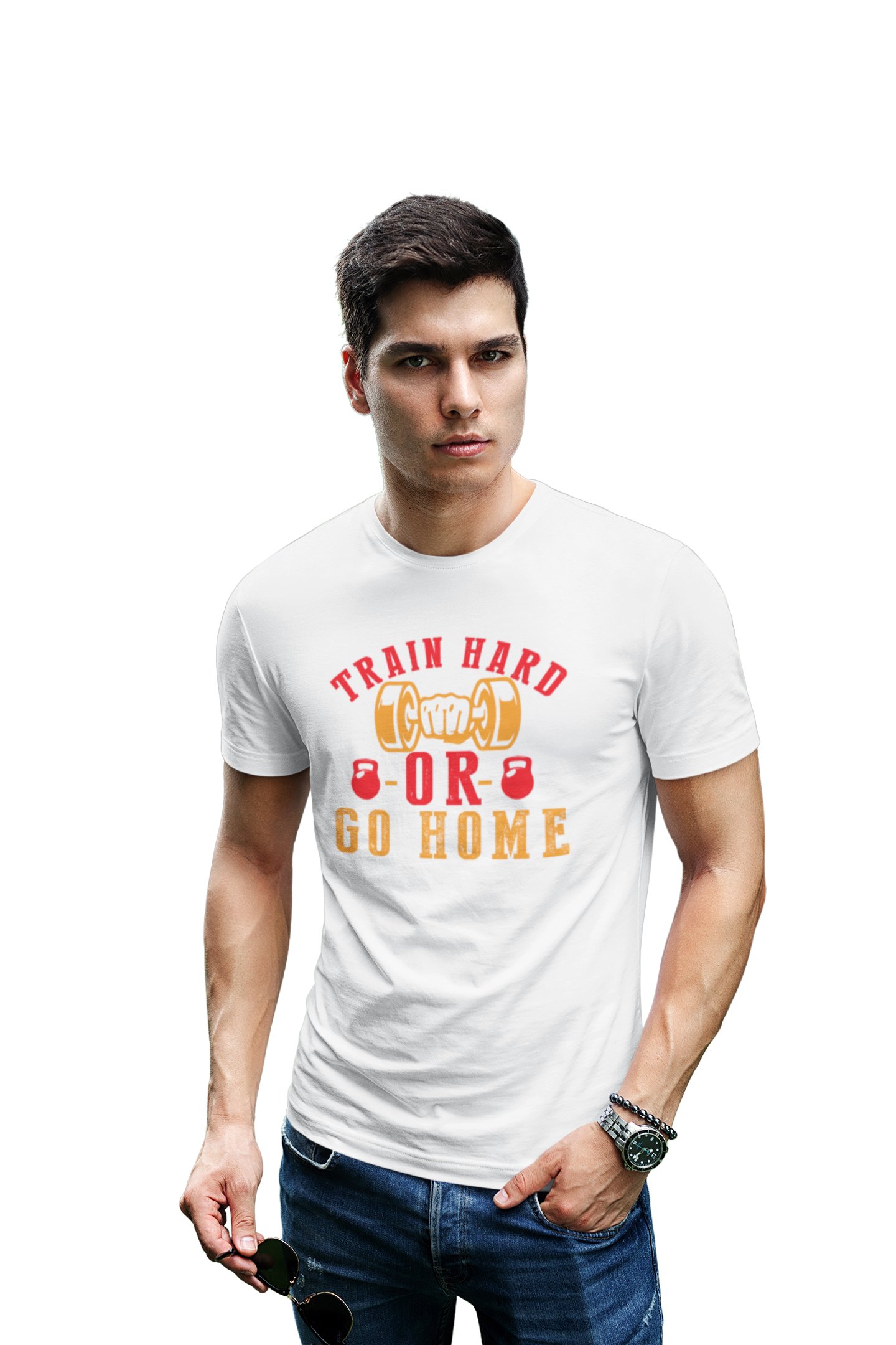 Train Hard or Go Home, Round Neck Gym Tshirt (BG Red, Golden) (White Tshirt) - Clothes for Gym Lovers - Foremost Gifting Material for Your Friends and Close Ones