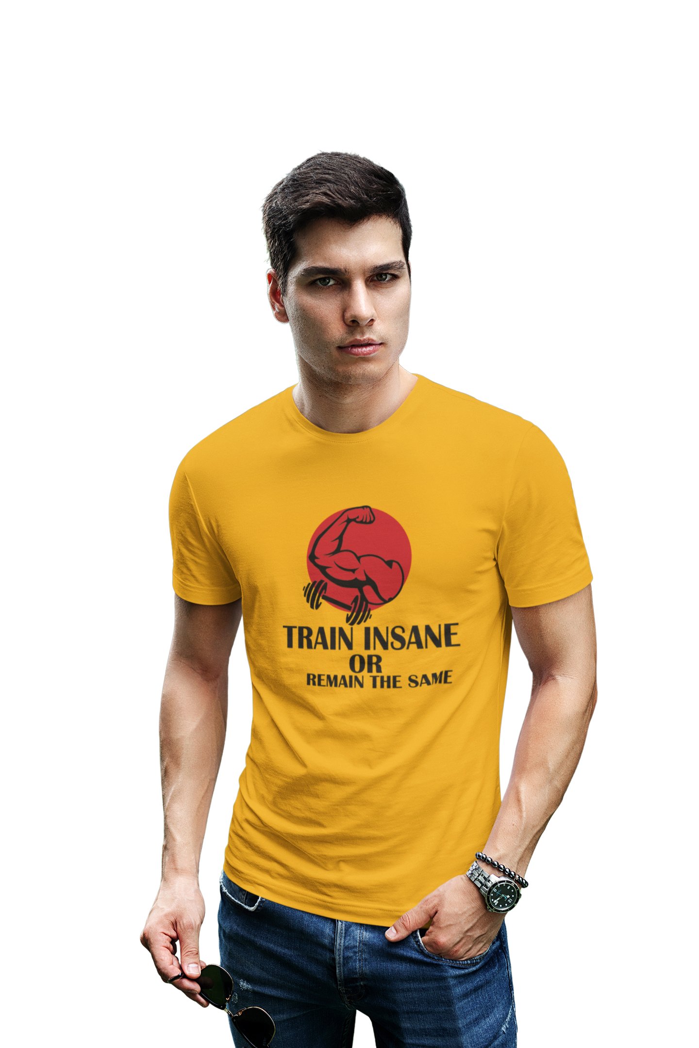 Train Insane Or Remain The Same, (BG Circle Cherry), Round Neck Gym Tshirt (Yellow Tshirt) - Clothes for Gym Lovers - Suitable for Gym Going Person - Foremost Gifting Material for Your Friends and Close Ones