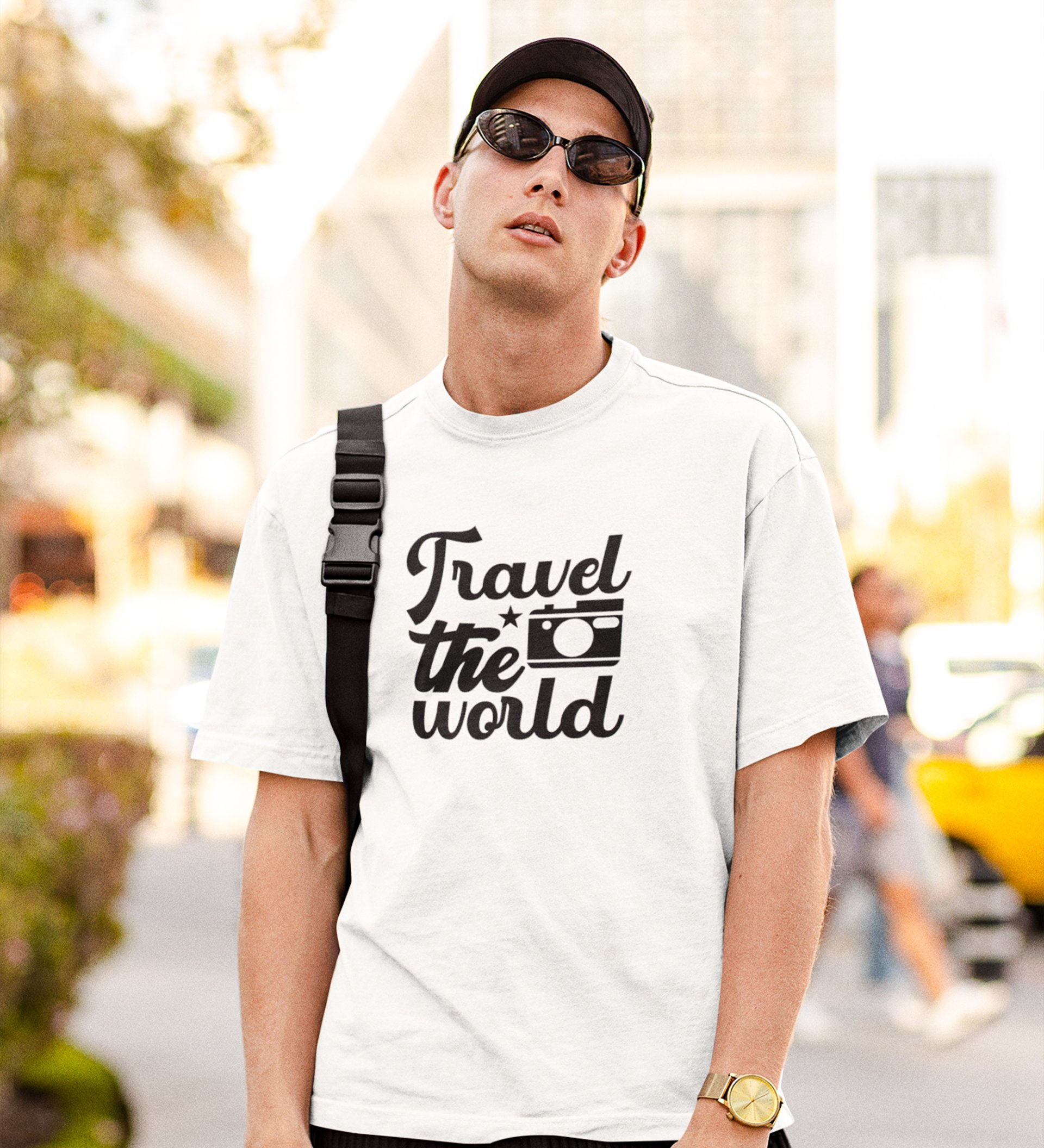 JD.TRENDS Travel The World White Round Neck Cotton Half Sleeved Men's T-Shirt with Printed Graphics