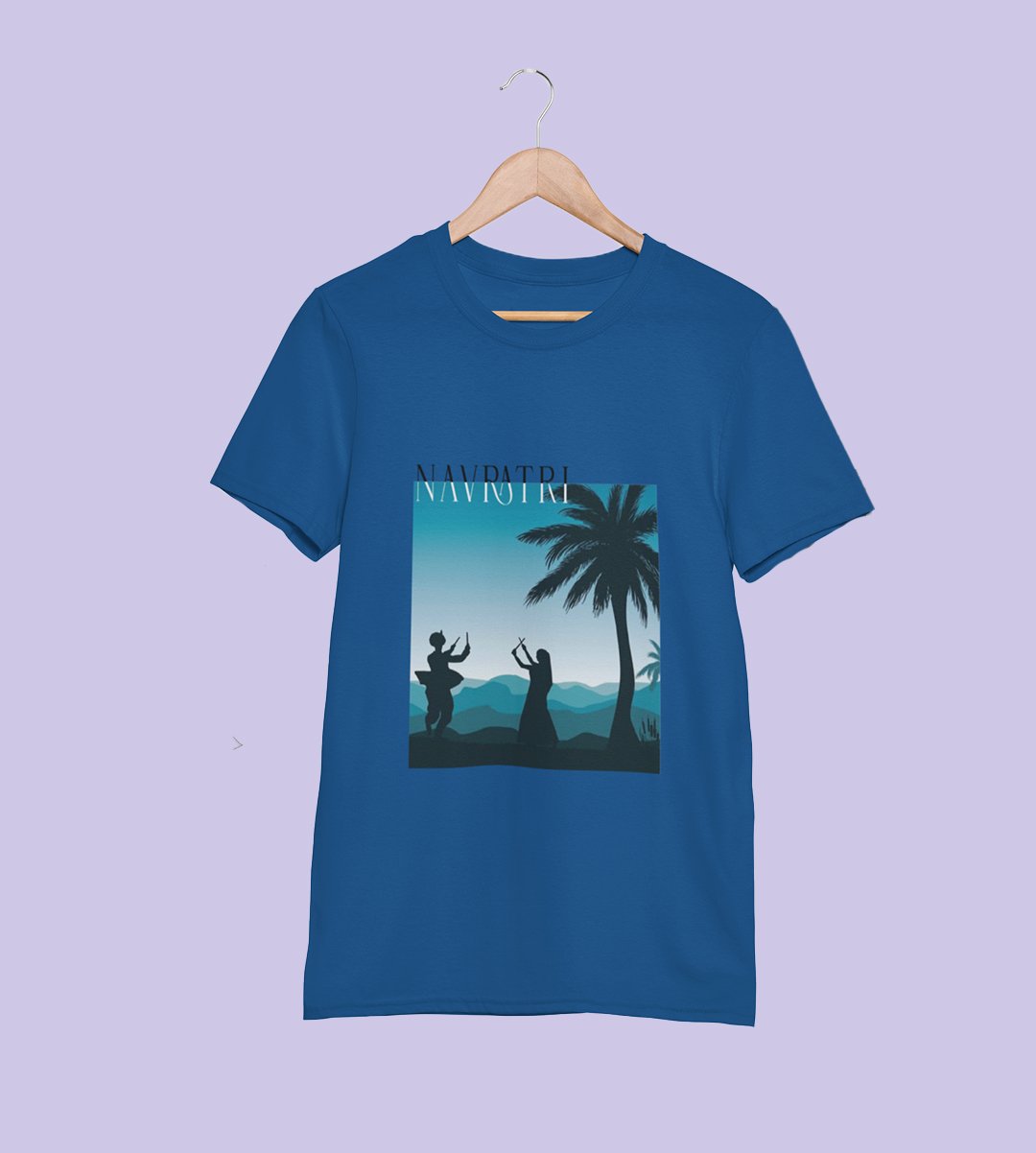Tree scenery printed unisex adults round neck cotton half-sleeve blue tshirt specially for Navratri festival/ Durga puja