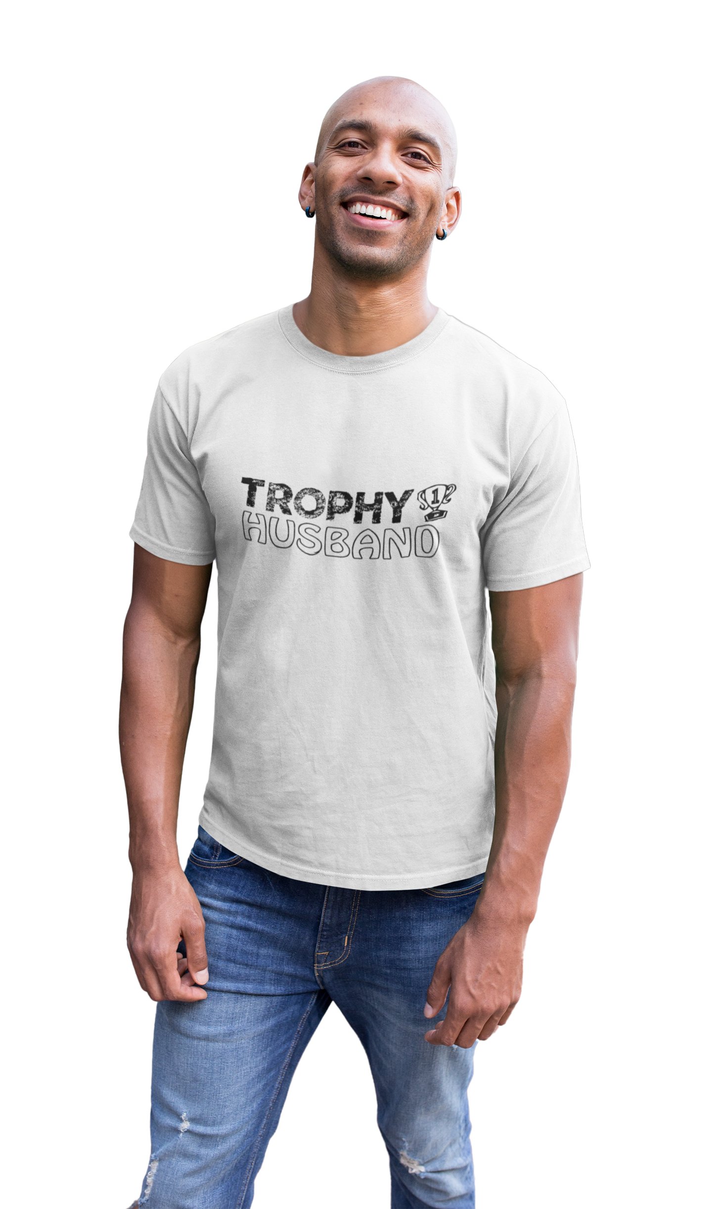 Trophy husband -printed family themed cotton blended half-sleeve t-shirts made for men (white)