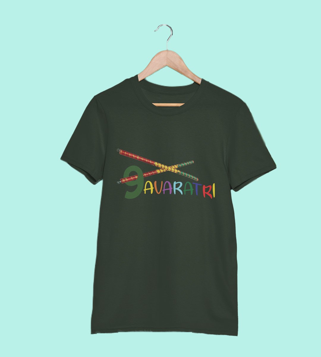 Two dandiyas printed unisex adults round neck cotton half-sleeve green tshirt specially for Navratri festival/ Durga puja