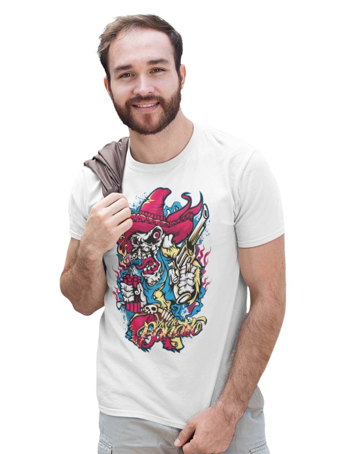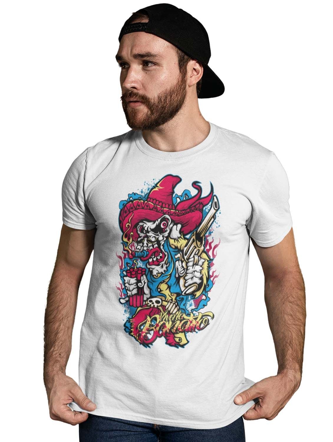 Skull Cowboy White Round Neck Cotton Half Sleeved T-Shirt with Printed Graphics