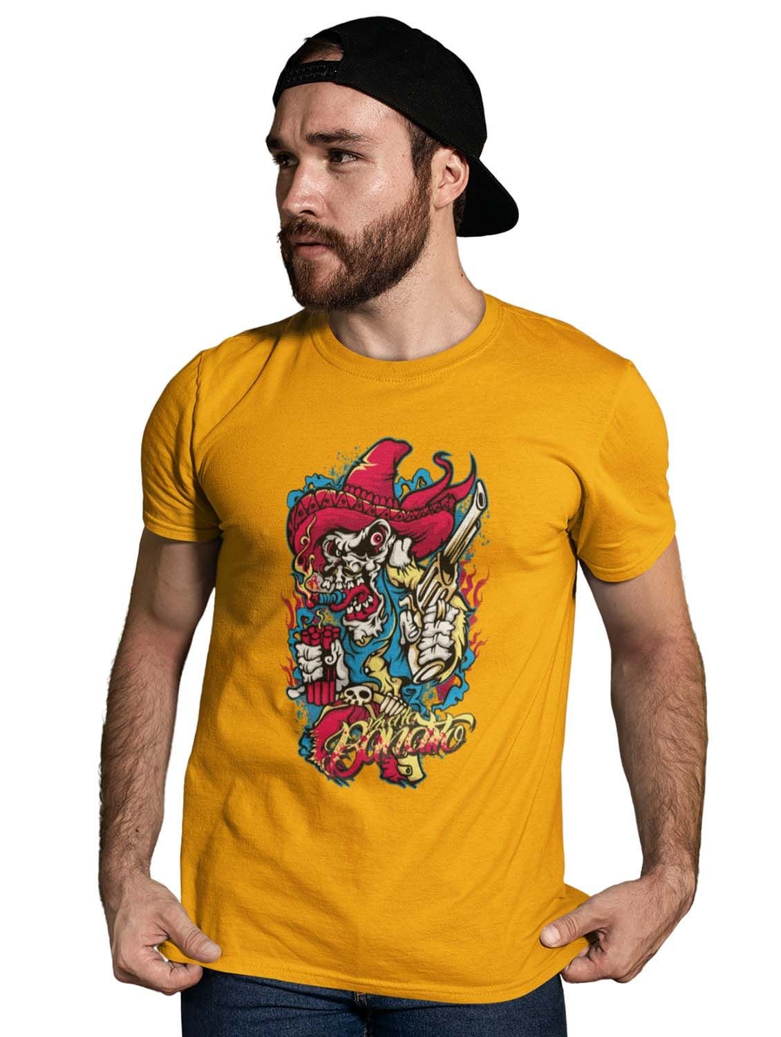 Skull Cowboy Yellow Round Neck Cotton Half Sleeved T-Shirt with Printed Graphics