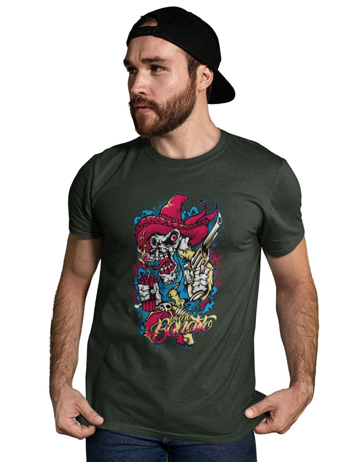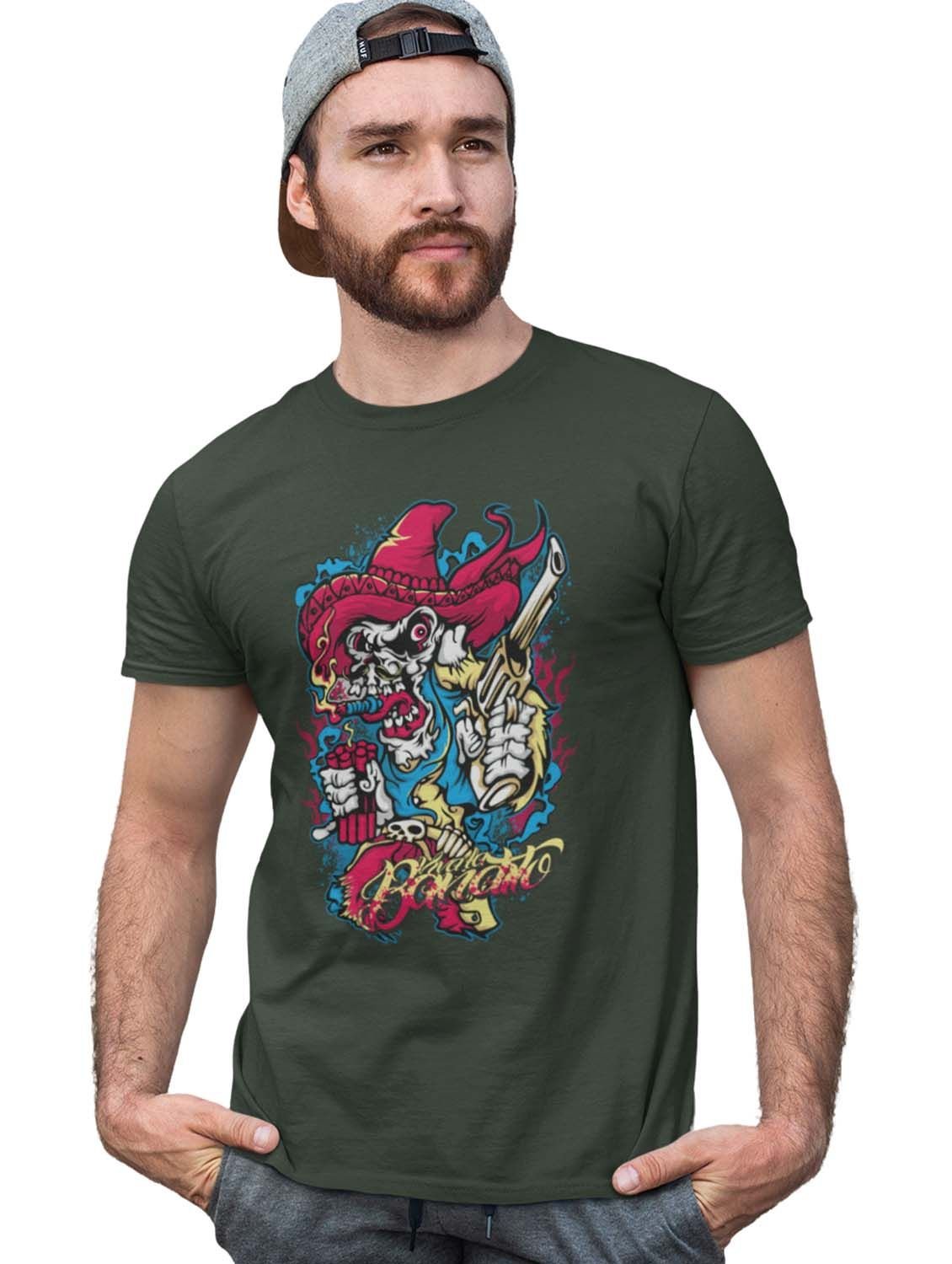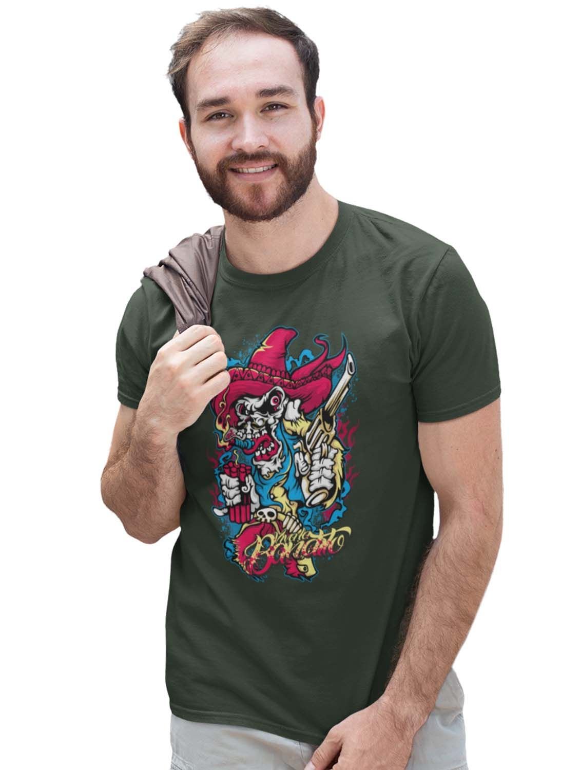 Skull Cowboy Green Round Neck Cotton Half Sleeved T-Shirt with Printed Graphics