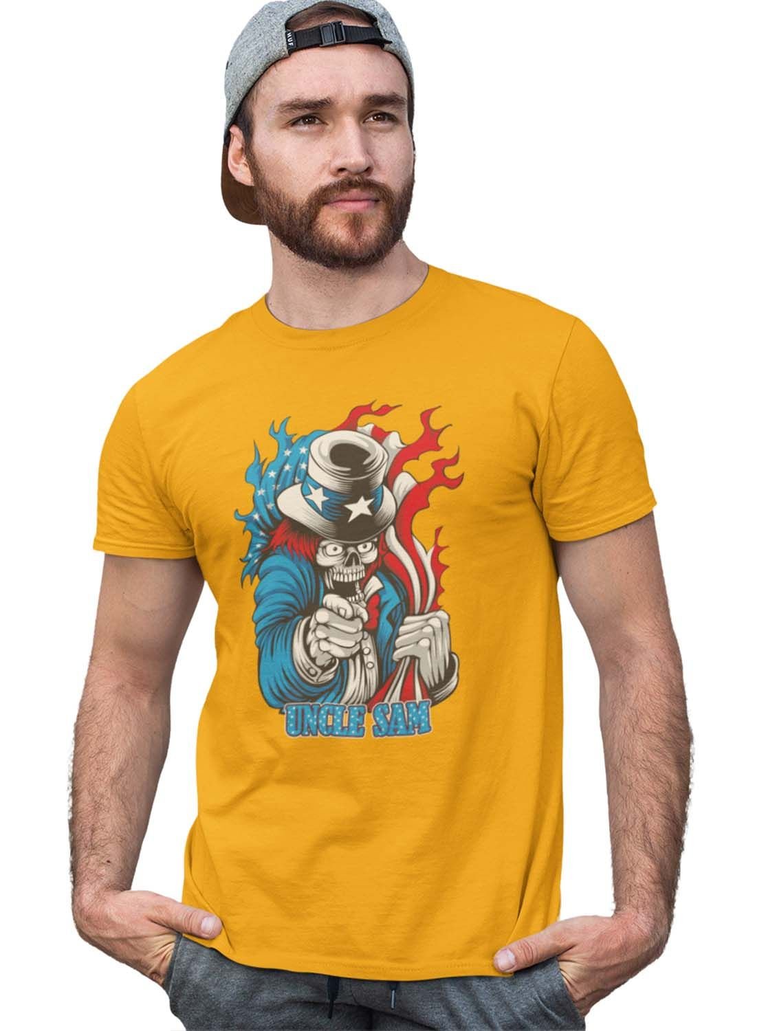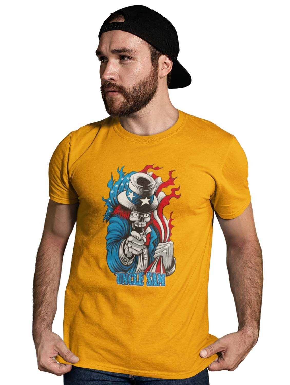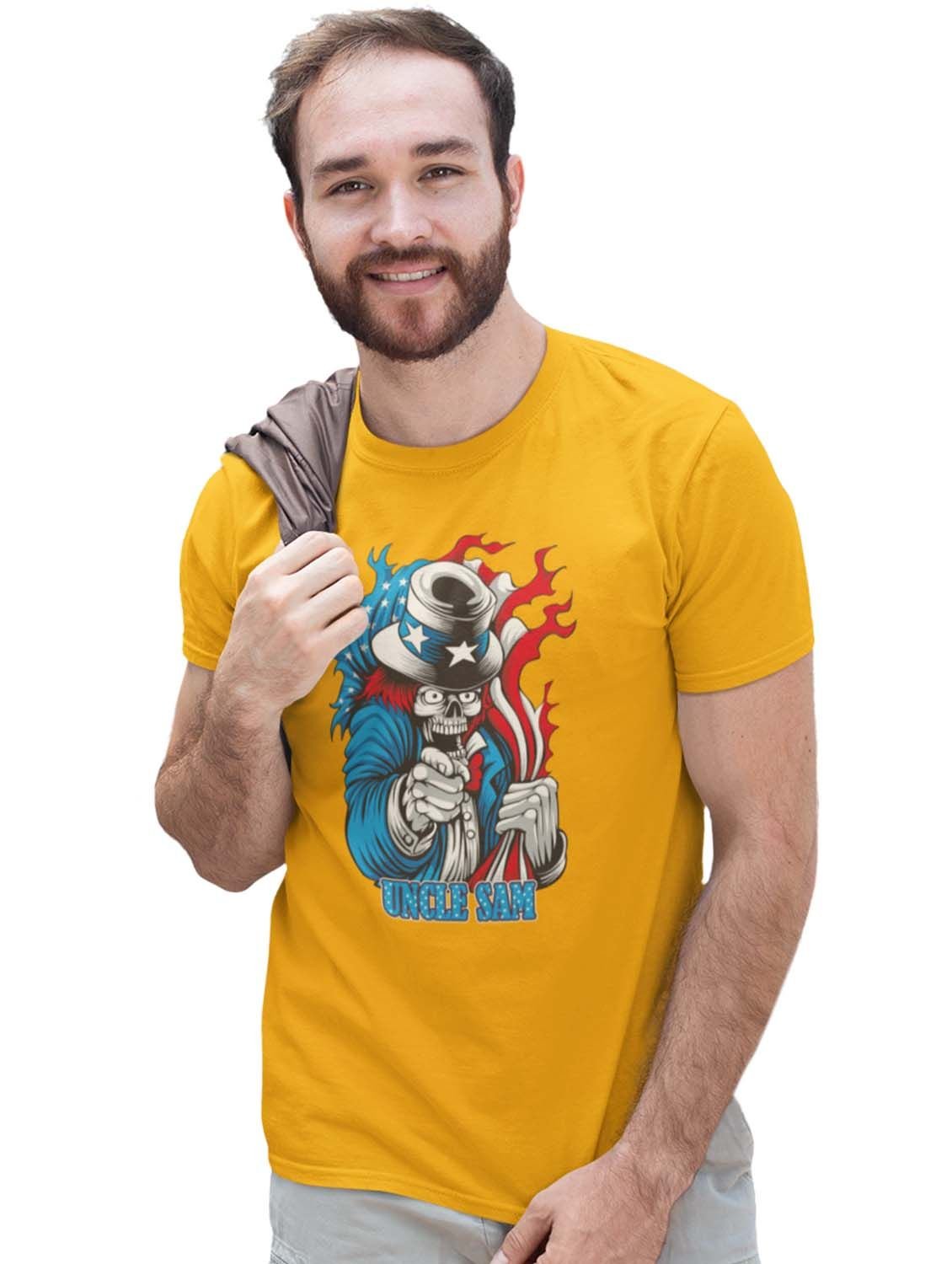 Uncle Sam Yellow Round Neck Cotton Half Sleeved T-Shirt with Printed Graphics