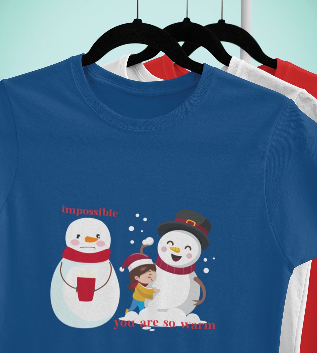Warm Snowman : Beautifully Printed T-shirt (Blue) Perfect Gift For Christmas Eve