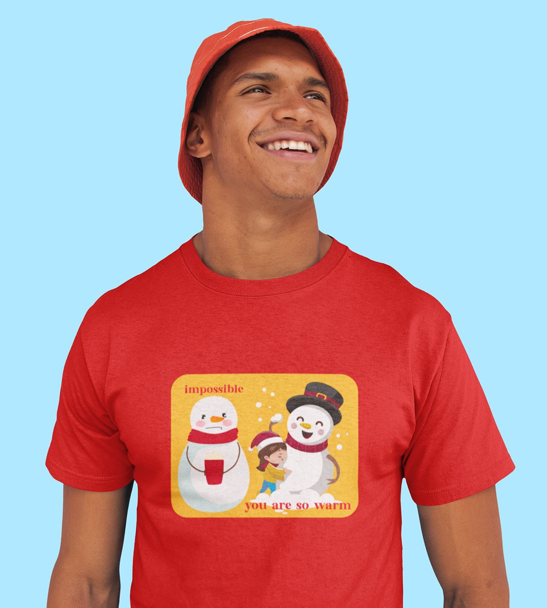 Warm Snowman : Beautifully Printed T-shirt (Red) Perfect Gift For Christmas Eve