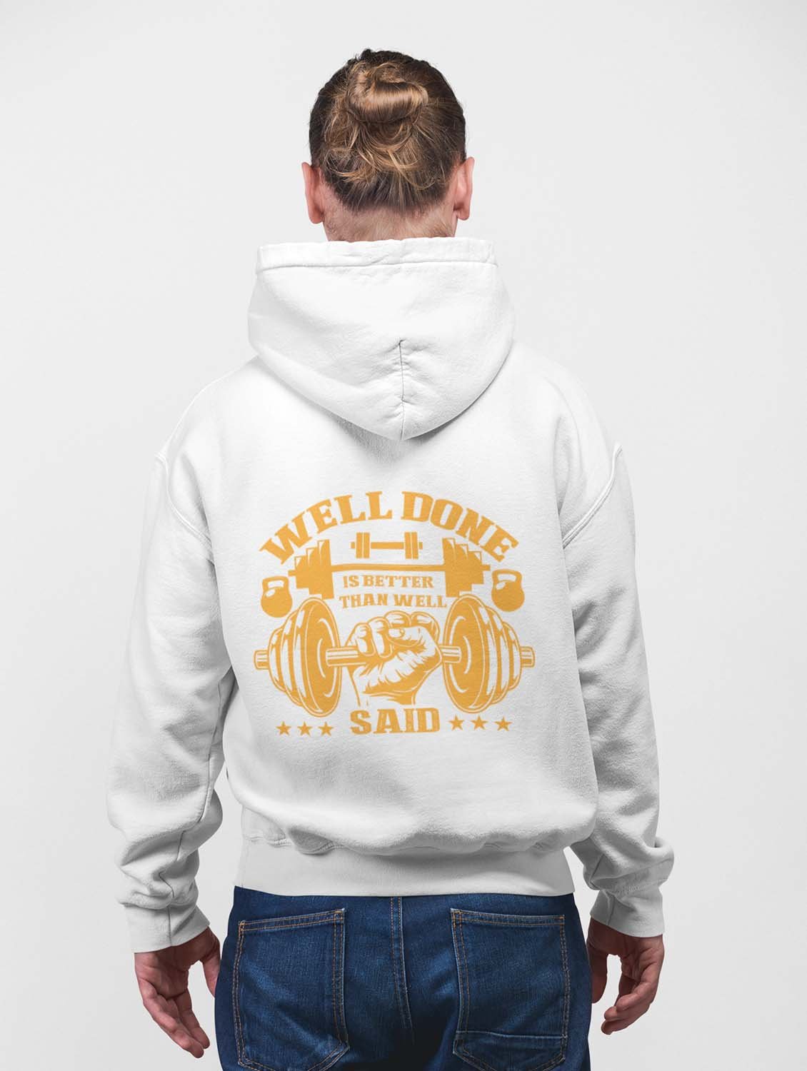 Well Done is Better Than Well Said (BG Golden) printed artswear white hoodies for winter casual wear specially for Men