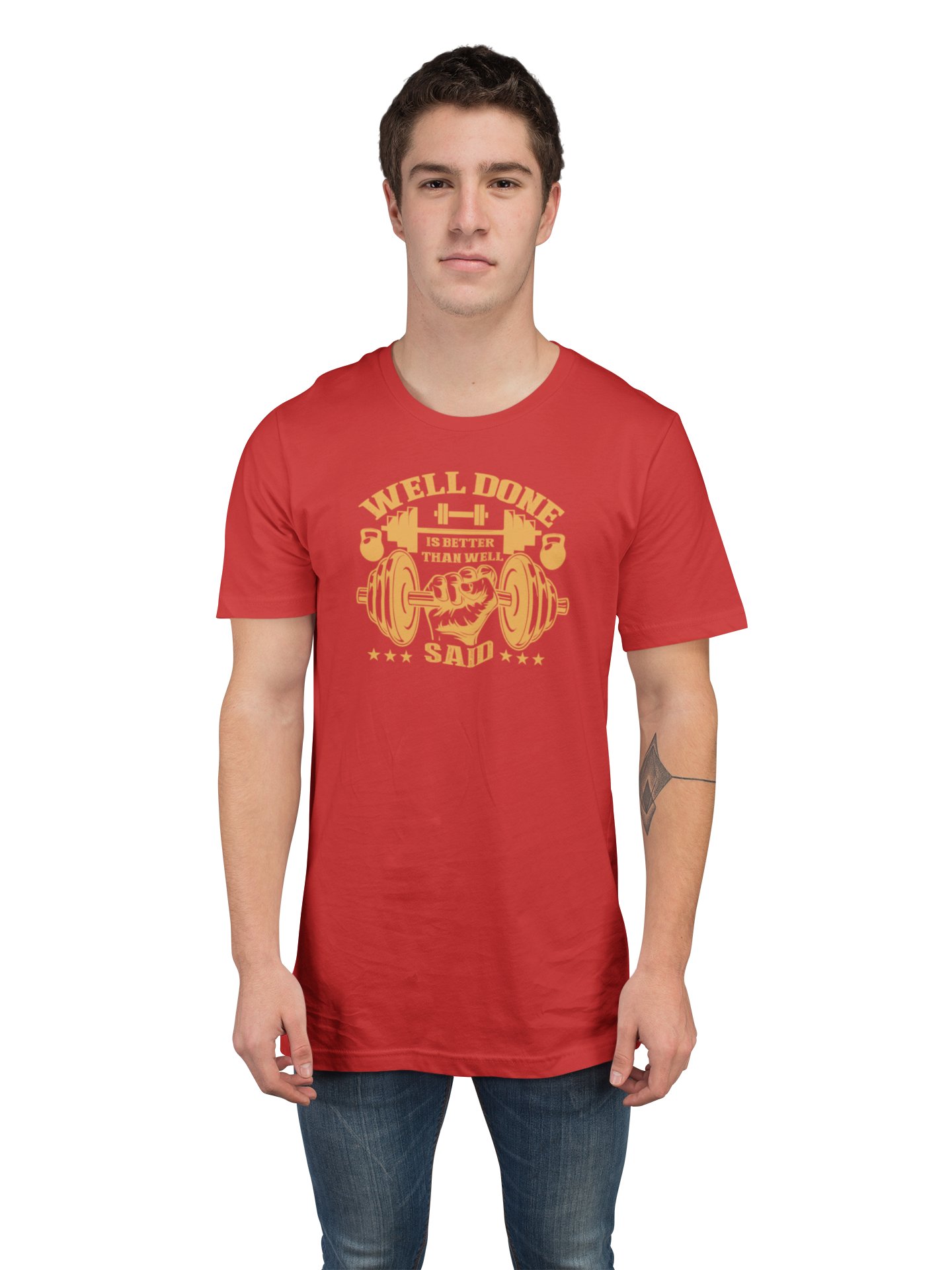 Welldone Is Better Than Well Said, (BG Golden) Round Neck Gym Tshirt (Red Tshirt) - Foremost Gifting Material for Your Friends and Close Ones