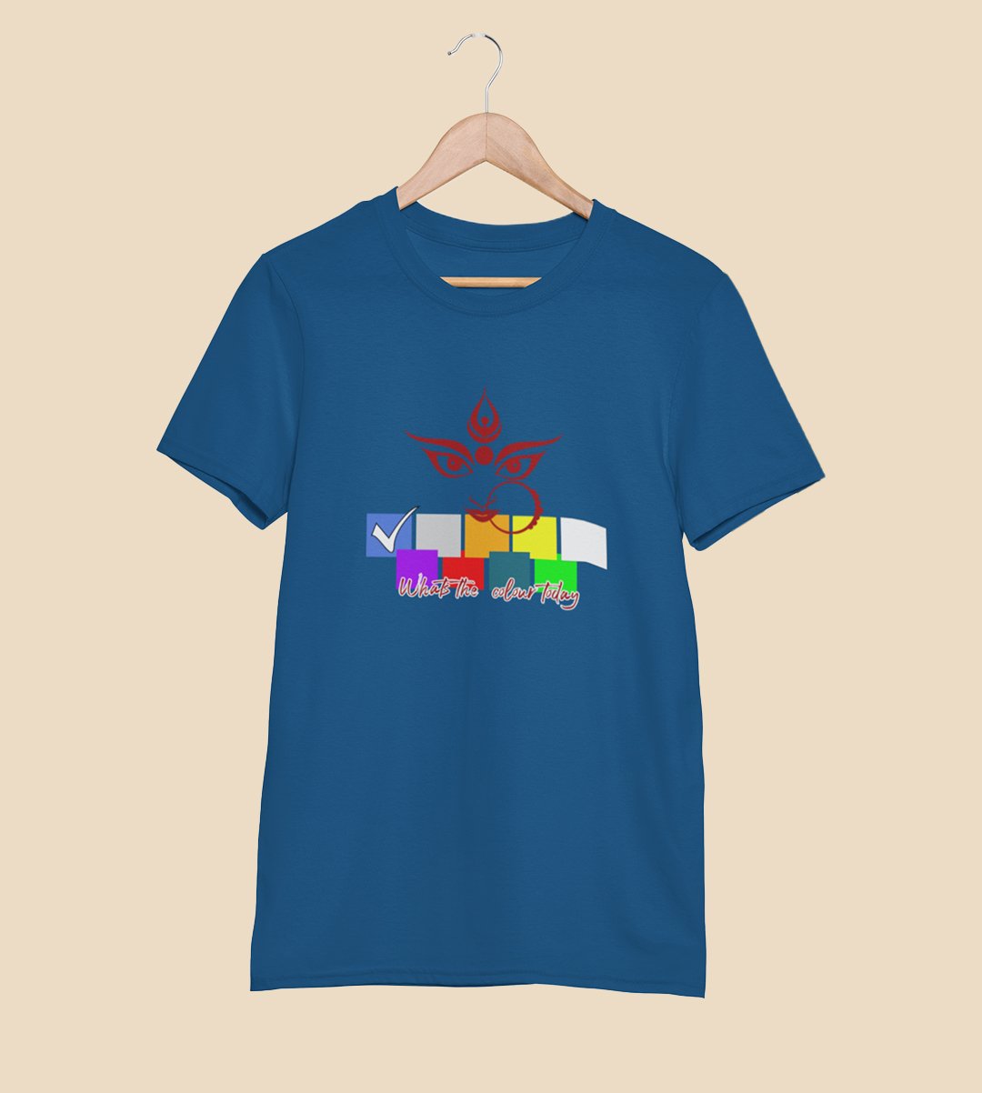 Whats the colour today printed unisex adults round neck cotton half-sleeve blue tshirt specially for Navratri festival/ Durga puja