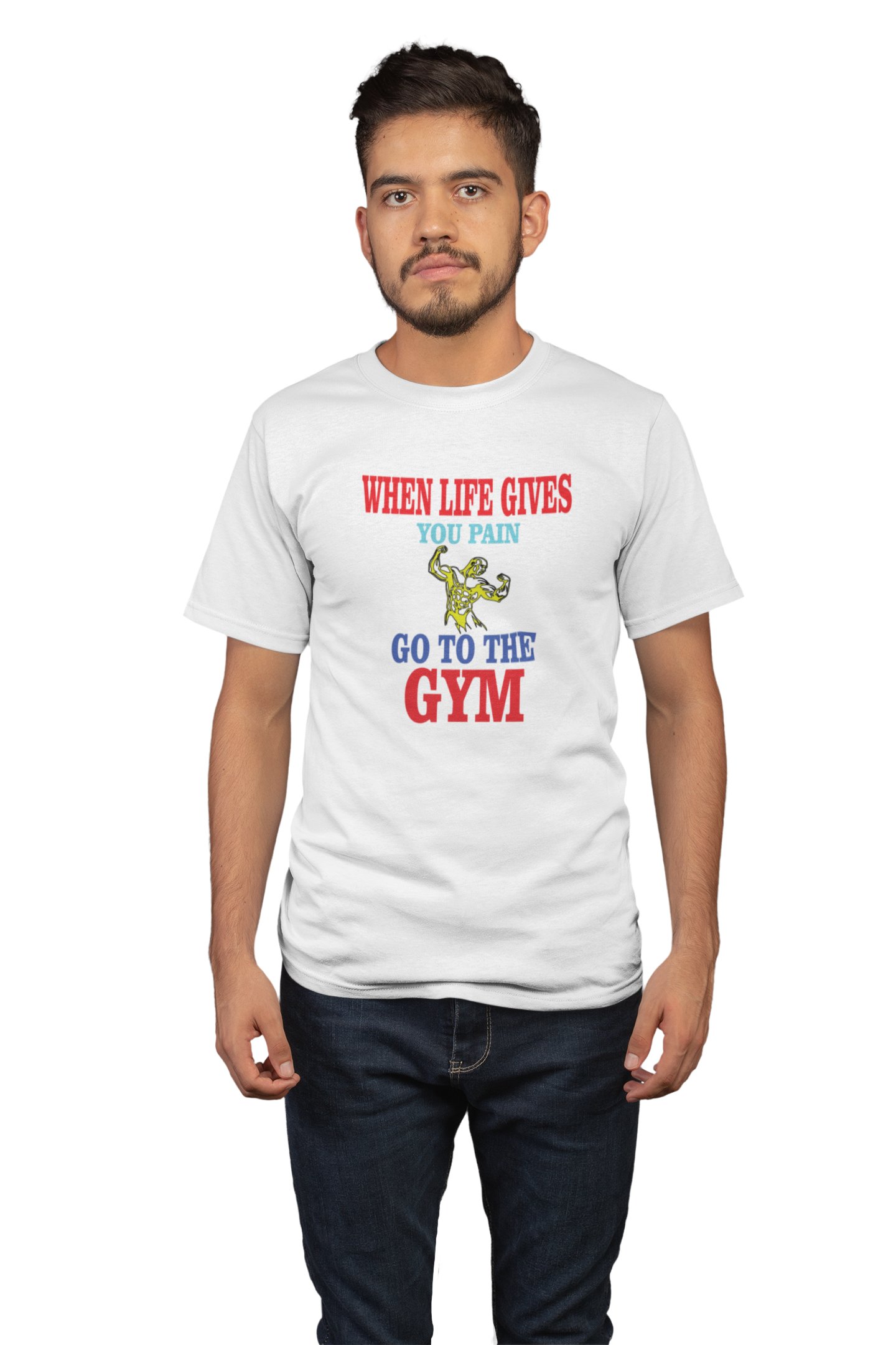 When Life Gives You Pain, Go To The Gym, Round Neck Gym Tshirt (White Tshirt) - Clothes for Gym Lovers - Foremost Gifting Material for Your Friends and Close Ones