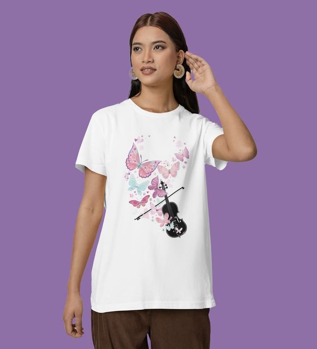 Wings of Melody: Elegant Violin and Butterflies Graphic Printed Black T-Shirt
