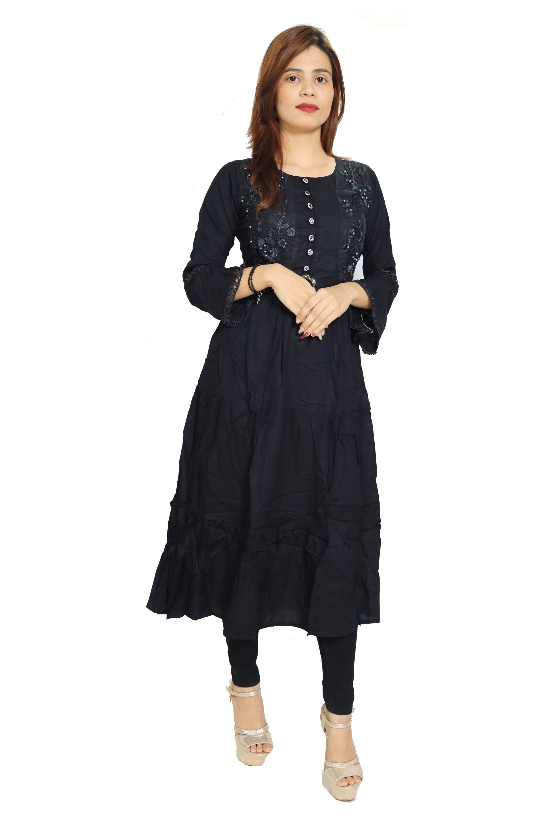Black flowers- buttons embroided straight Kurti for Womens/ girls (black kurti)- Made up of Rayon and designed for you plesant and comfy