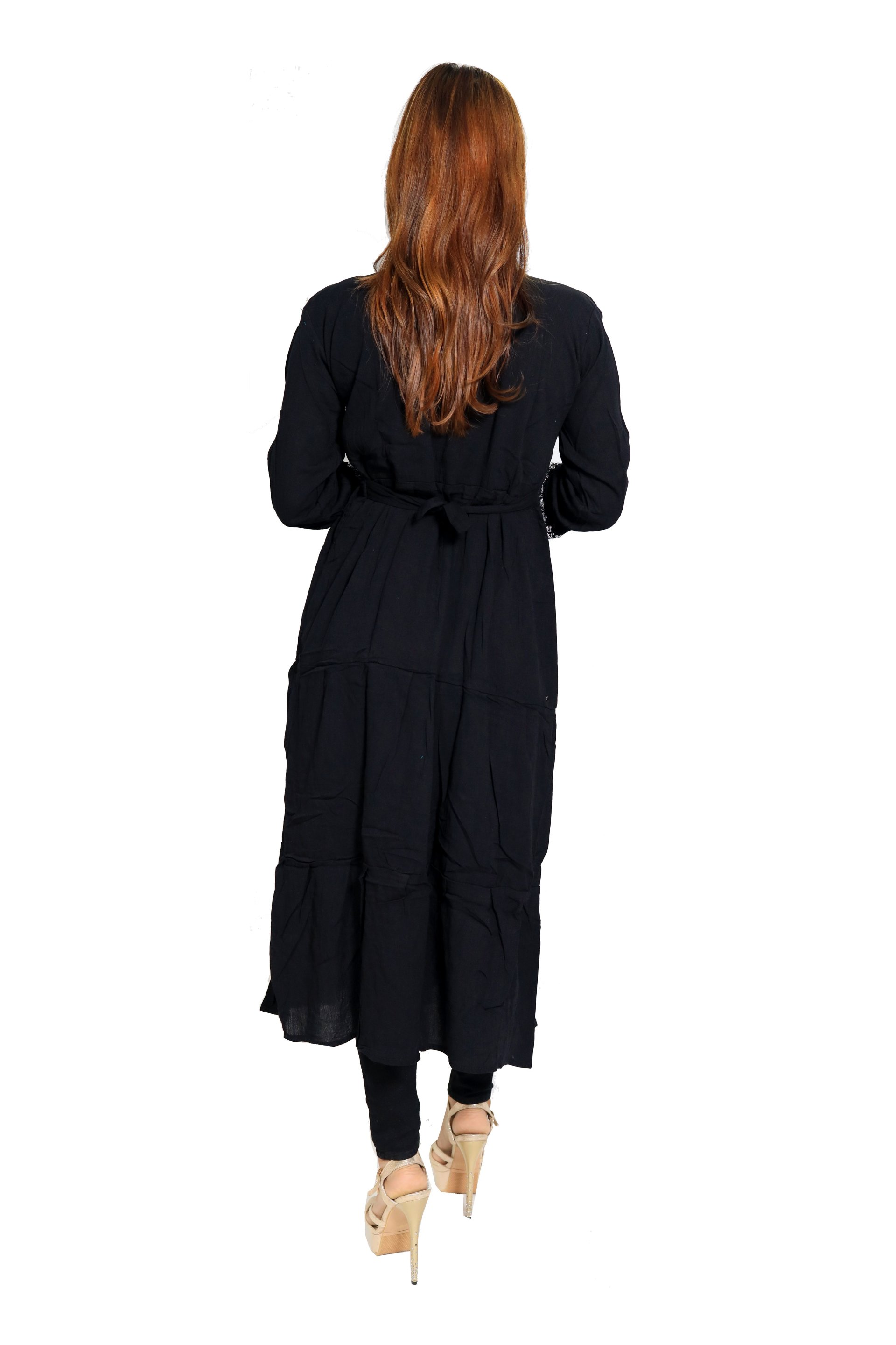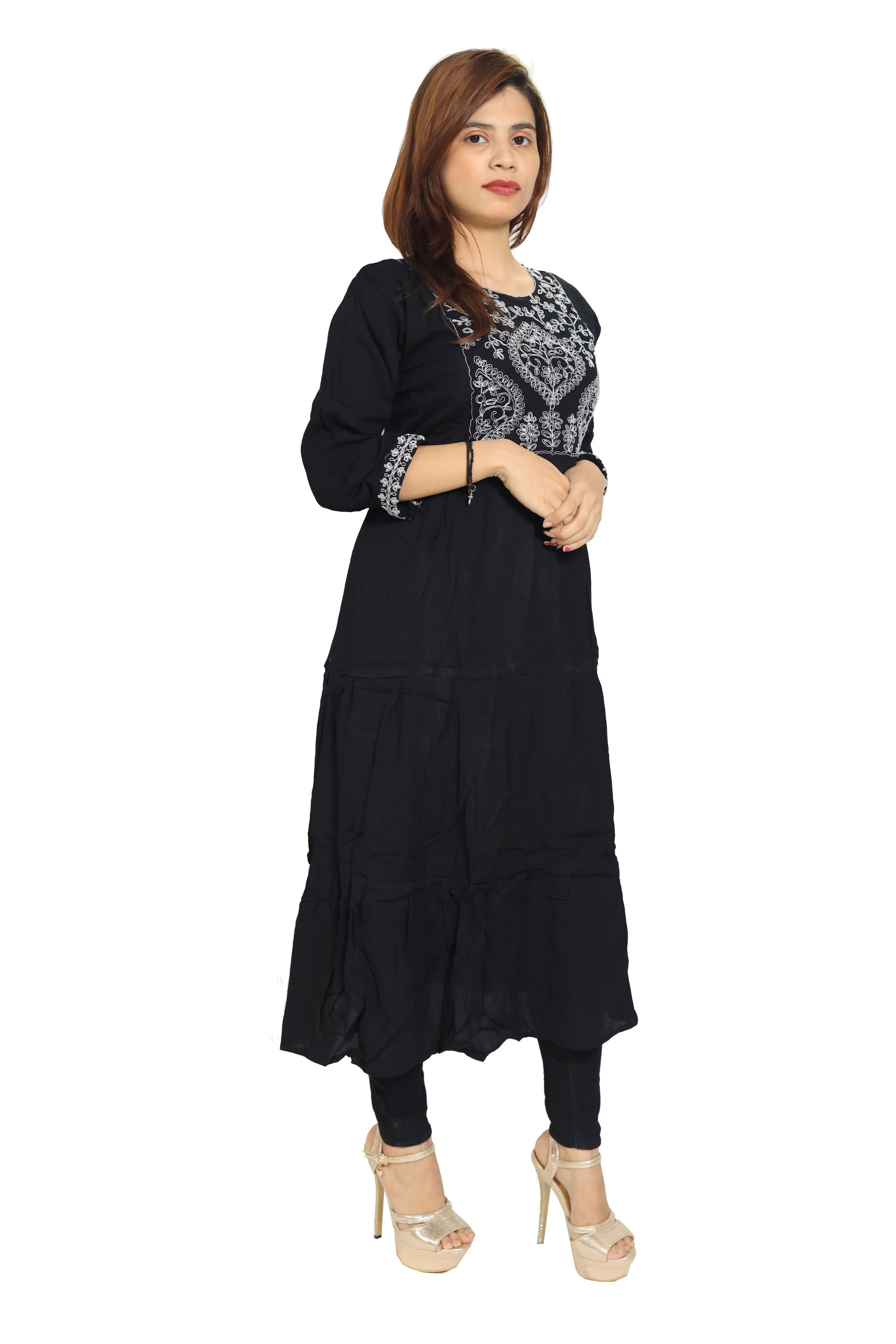 Karenji shaped designs embroided straight Kurti for Womens/ girls (black kurti)- Made up of Rayon and designed for you plesant and comfy