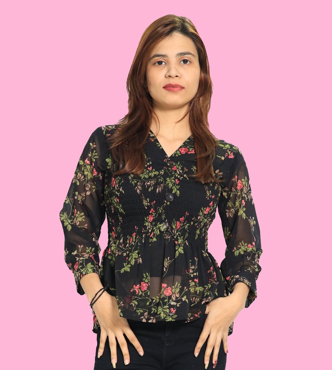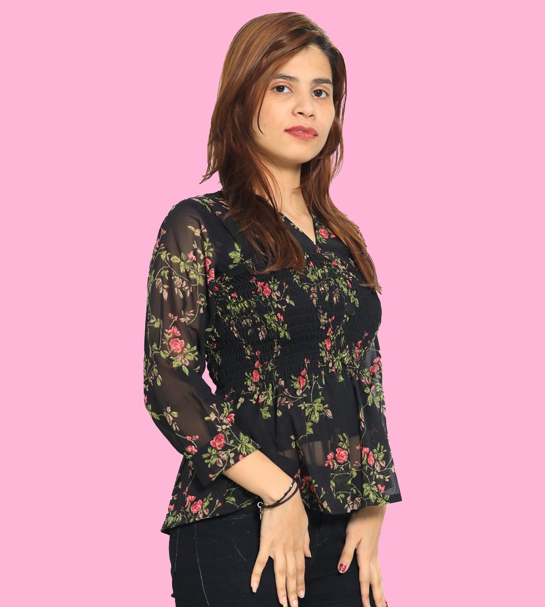 Women loves to wear top of any age groups. The fashion is not only limited upto young girls / teenagers but some married women also love to wear it. The recognization of top is very much popular in 21st century. It is used by the modernized ladies. Easy to wear. It looks good with jeans or jeggings. We have brought you a full collection of floral designs printed top to choose from. This is made up of Rayon and designed for your plesant and cozy.
