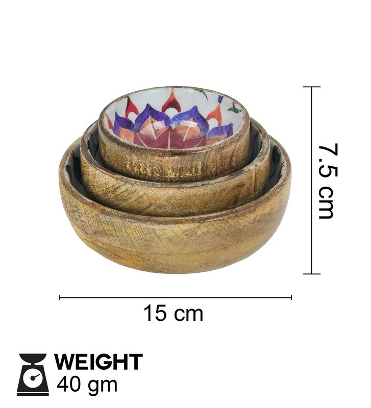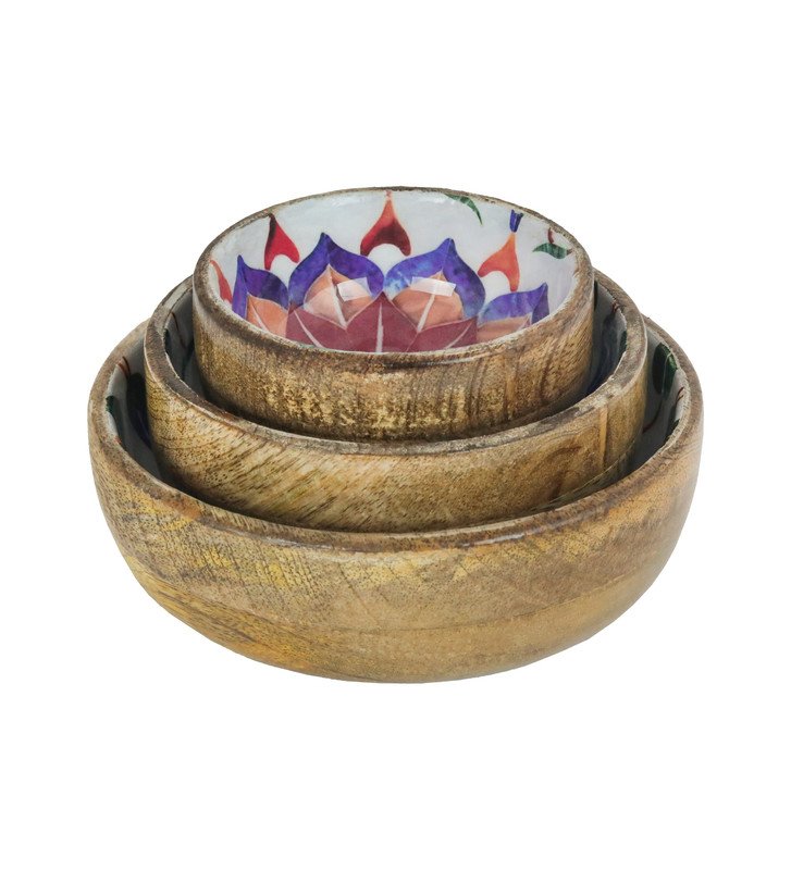 Wooden Minakari Bowl Set Of 3, Mandala Minakari Bowls With Wooden Touch For Kitchen
